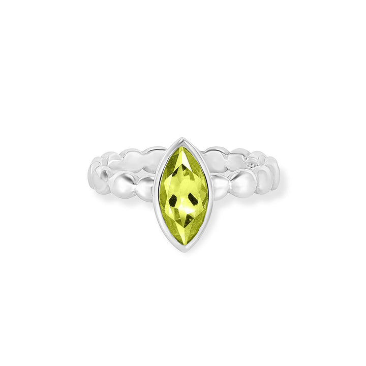 Handmade in sterling silver. Featuring a 10 x 5mm marquise faceted peridot set on a dewdrop design band. Width - 2-2.5mm. Available in sizes J-S.