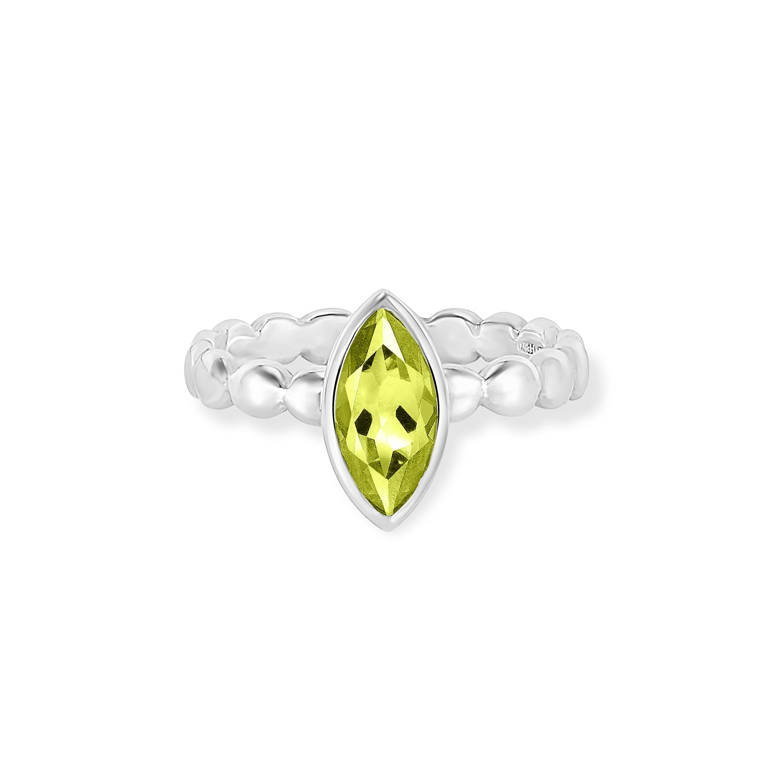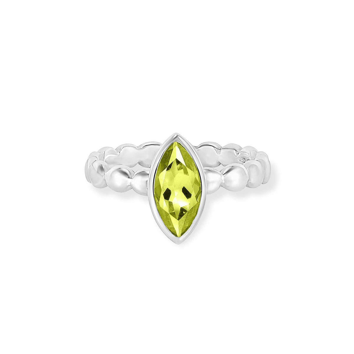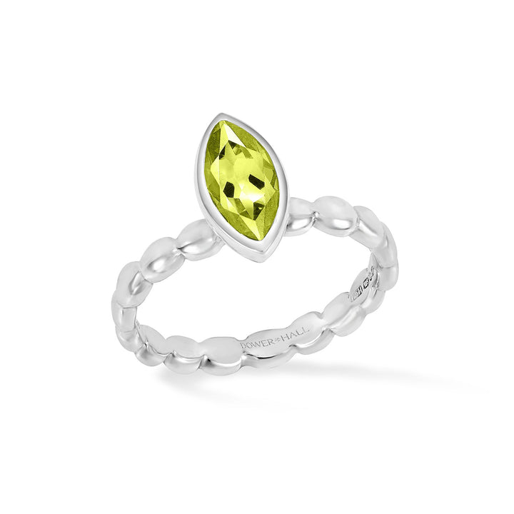 This Marquise Peridot Dewdrop Twinkle Ring by Dower & Hall is a stackable sterling silver design featuring a dewdrop design around the entire band, set with a 10 x 5mm marquise faceted peridot. Perfect for adding a pop of green color, this ring can be worn alone or stacked with other Twinkle rings for a personalized look. Available in sizes J-S, with custom sizes available on request.