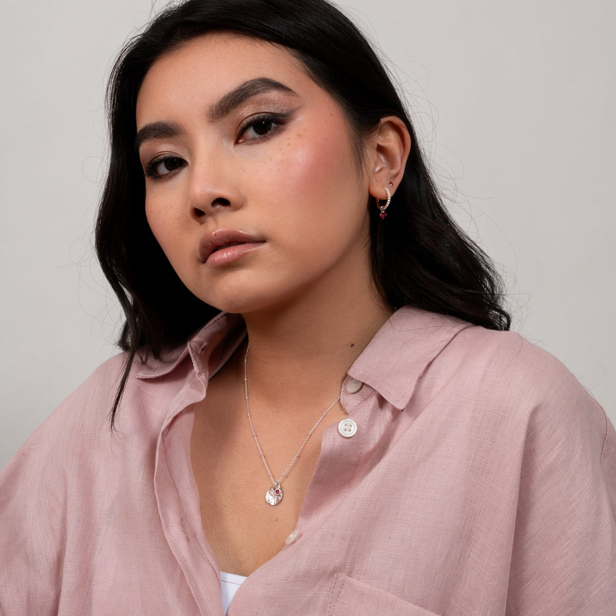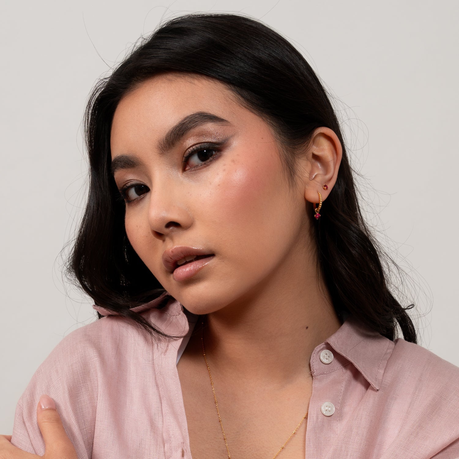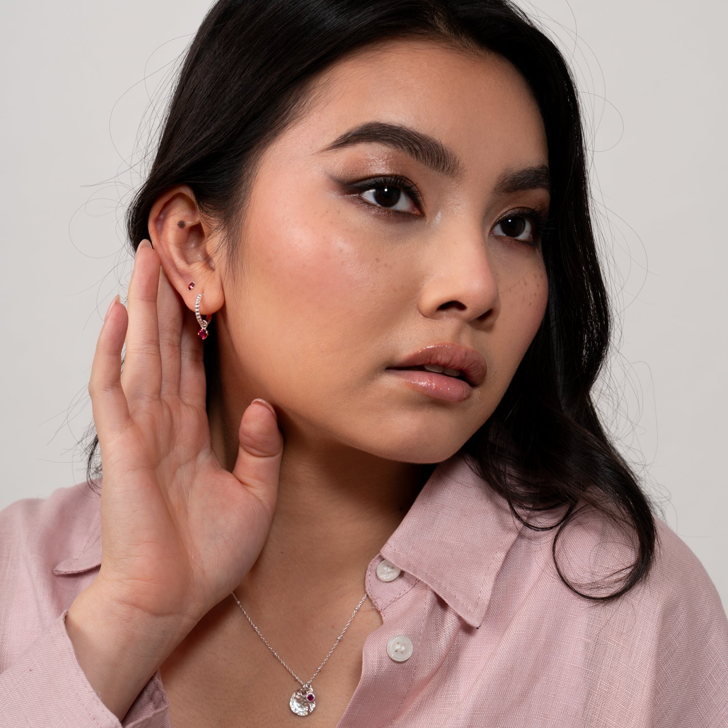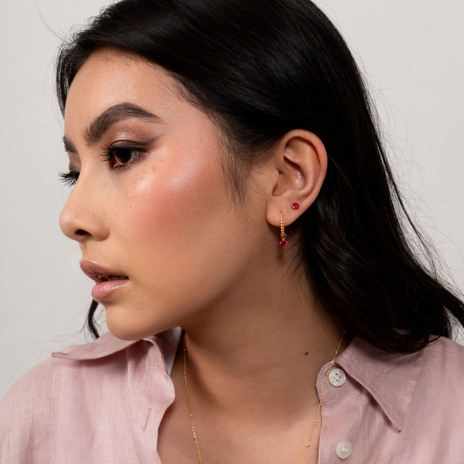 Available in sterling silver or 18ct yellow gold vermeil. Featuring 4mm garnet gemstones set in a four-claw signature lotus design with post and butterfly back.