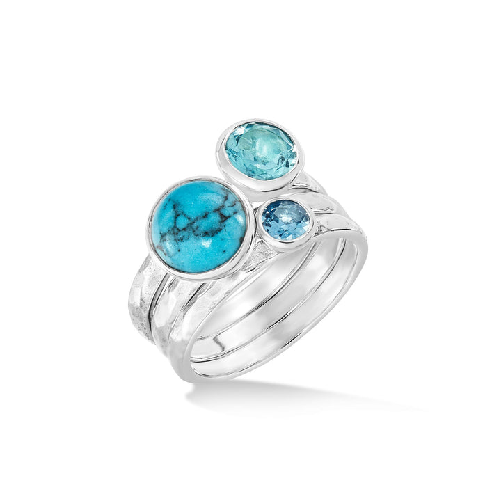 These Azure Twinkle Stacking Rings by Dower & Hall bring the colors of the beach to life, featuring a beautiful palette of stones. The set includes a 4mm round aquamarine set on a traditional hammered band, a 6mm blue topaz, and an 8mm cabochon turquoise on hammered bands. This handcrafted set adds a pop of color and elegance, perfect for stacking or wearing individually.