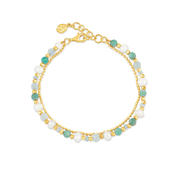 Handcrafted in sterling silver or with 18ct yellow gold vermeil finish. Faceted opalite, blue topaz, apatite, and freshwater pearls. Adjustable length: 7-8 inches.