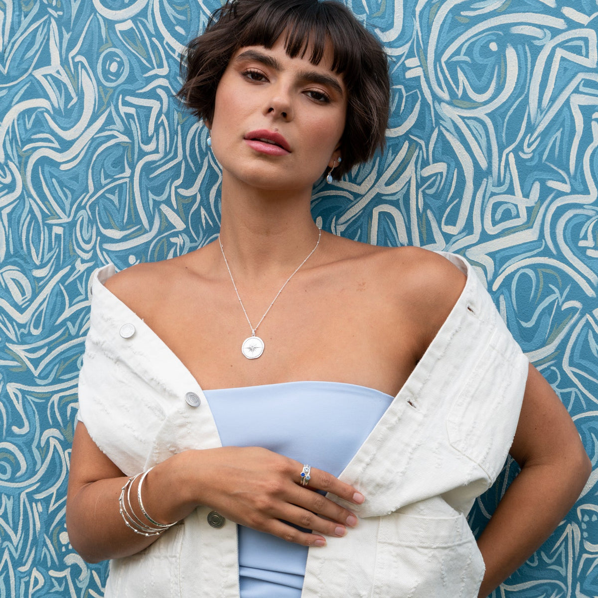 Handcrafted in sterling silver with a 5mm blue topaz, 4mm blue spinel, and 4mm aquamarine. Each piece is individually handmade and set in the London studio. Please allow five days for setting.