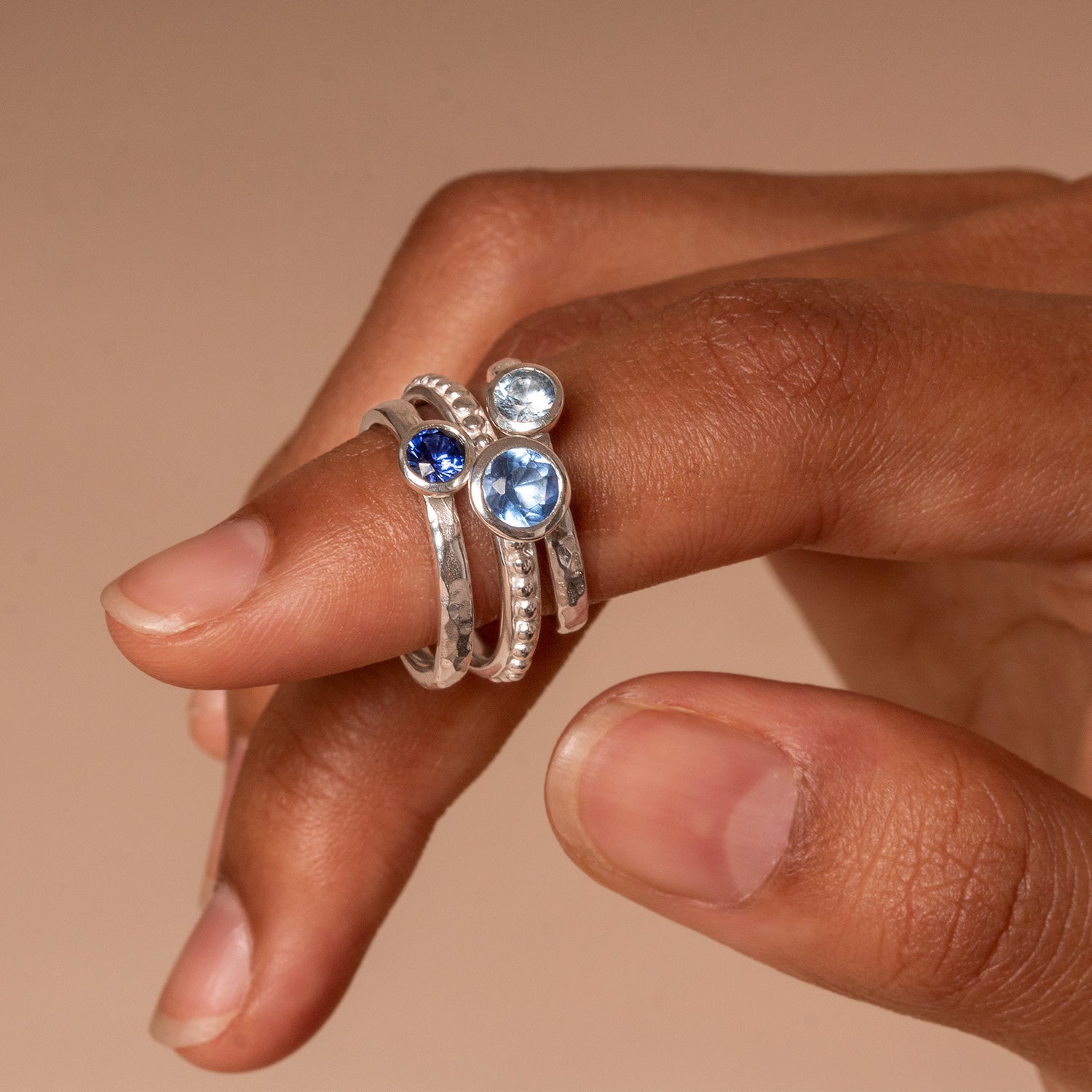 These Cosmic Twinkle Stacking Rings by Dower & Hall are the ultimate earthy blue ring stack for any collection. Featuring a 5mm blue topaz on a dotty band, a 4mm blue spinel on a hammered band, and a 4mm aquamarine on a signature hammered band, this set adds a cool, serene vibe to your style. Perfect for stacking or wearing individually, these rings are effortlessly chic.