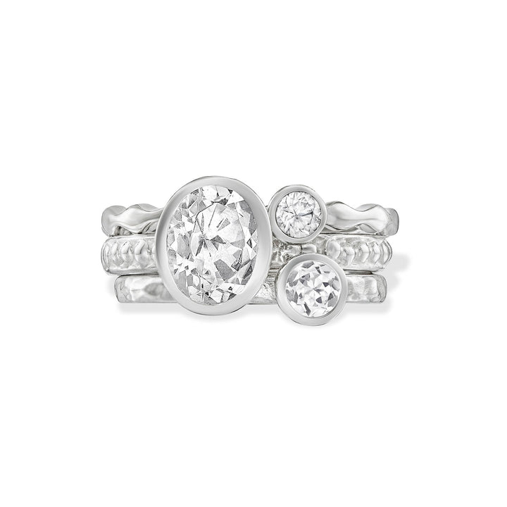 Handcrafted in sterling silver with an 8x6mm oval white topaz, 3mm white sapphire, and 4mm white topaz. Available in sizes J-S. Each piece is individually handmade and set in the London studio.