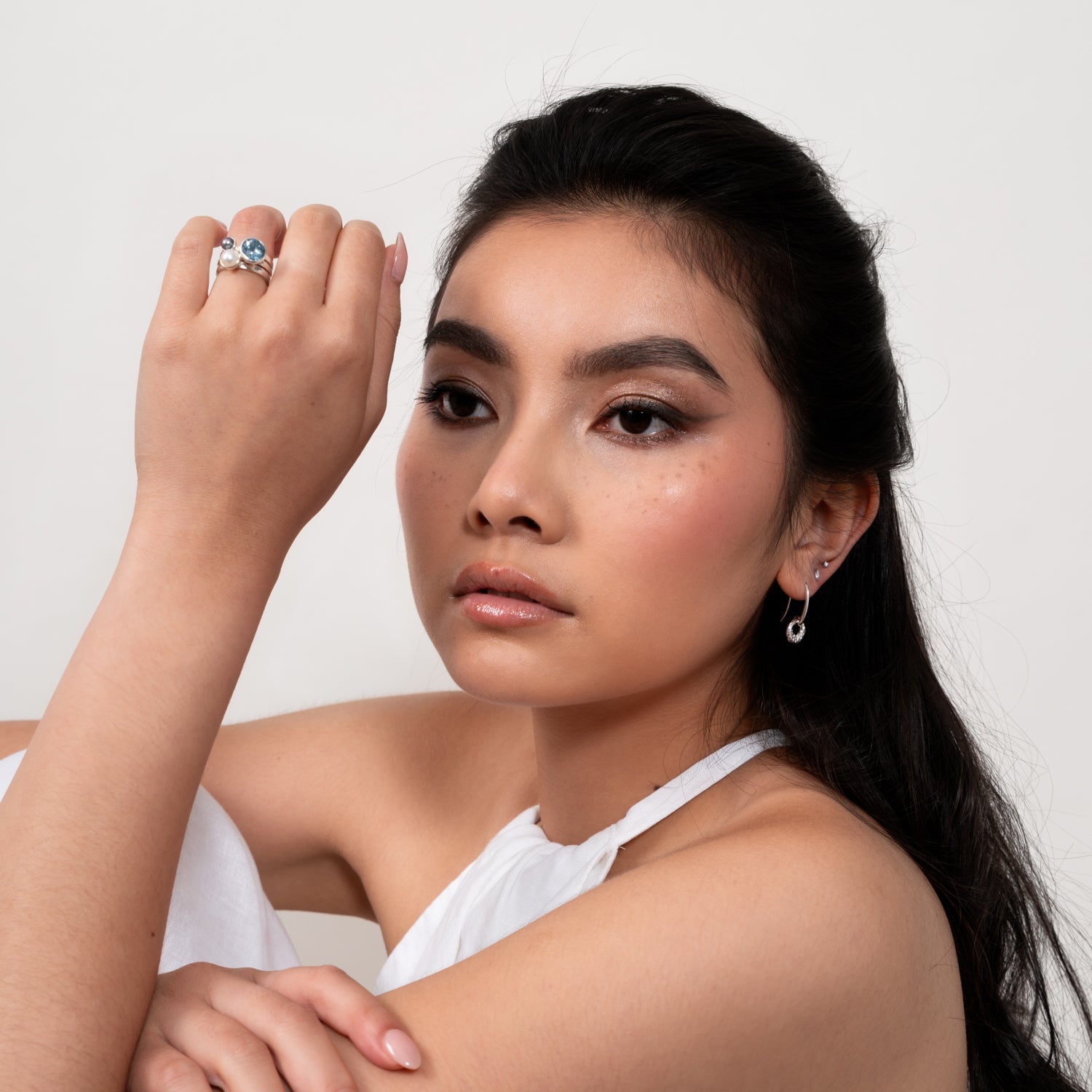 Handcrafted in sterling silver with an 8mm blue topaz, a 6mm dove grey freshwater pearl, and a 4mm peacock pearl, each on individual hammered bands. Each piece is individually handmade and set in the London studio. Please allow five days for setting.