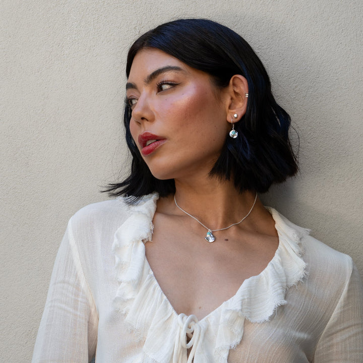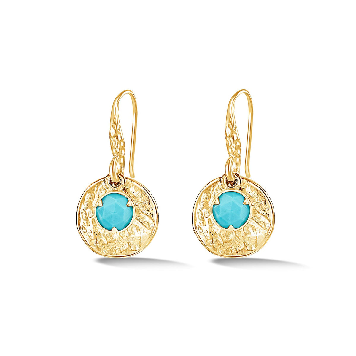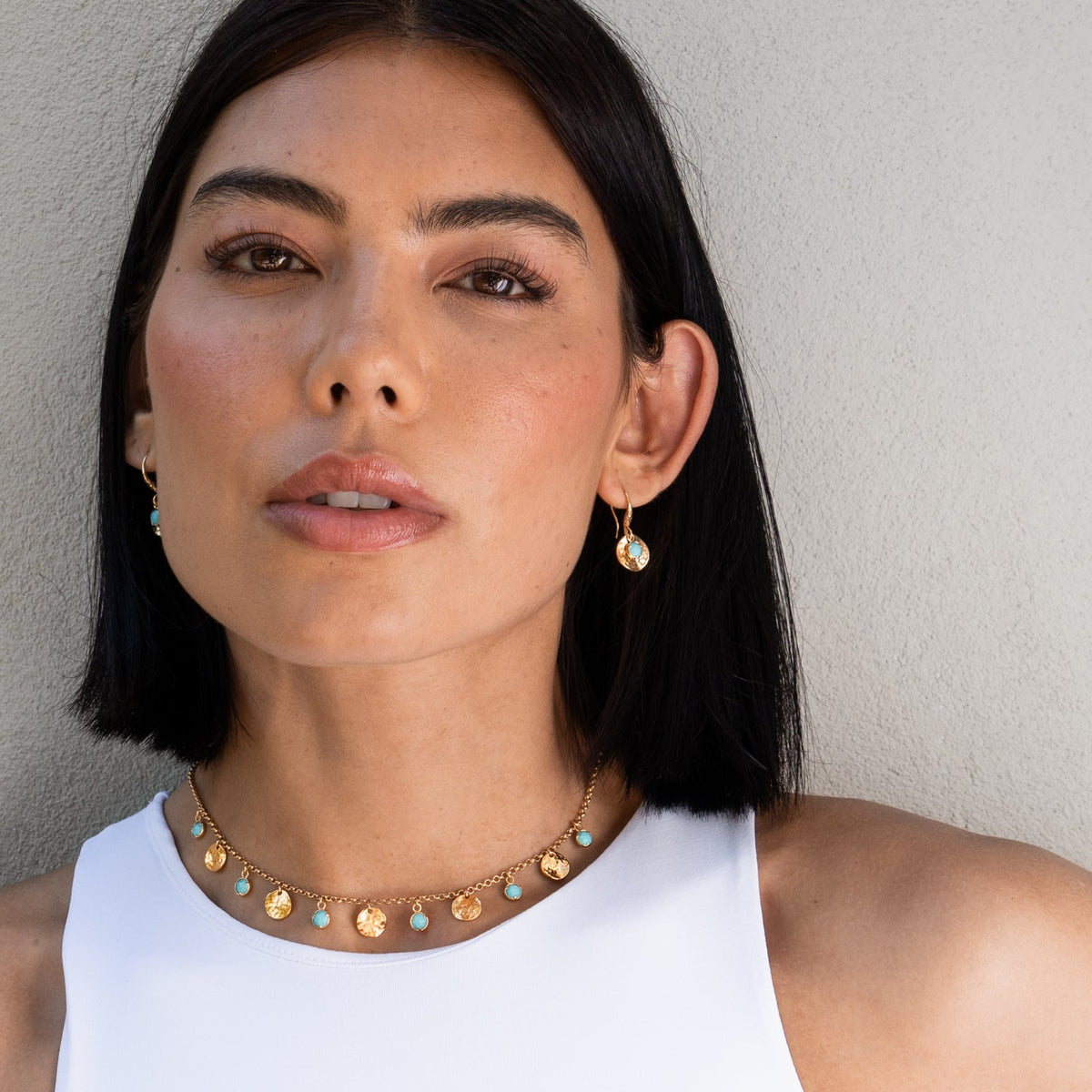 Available in sterling silver or 18ct yellow gold vermeil. Featuring 5mm turquoise gemstones and 13mm hammered discs, with a total length of approx. 27mm.