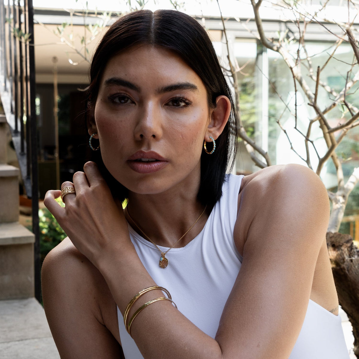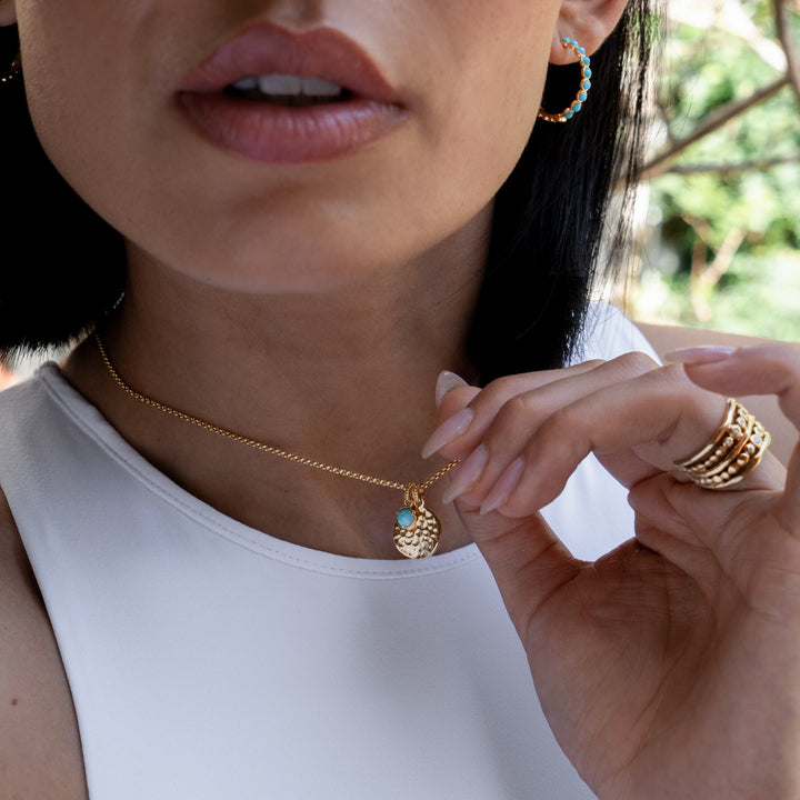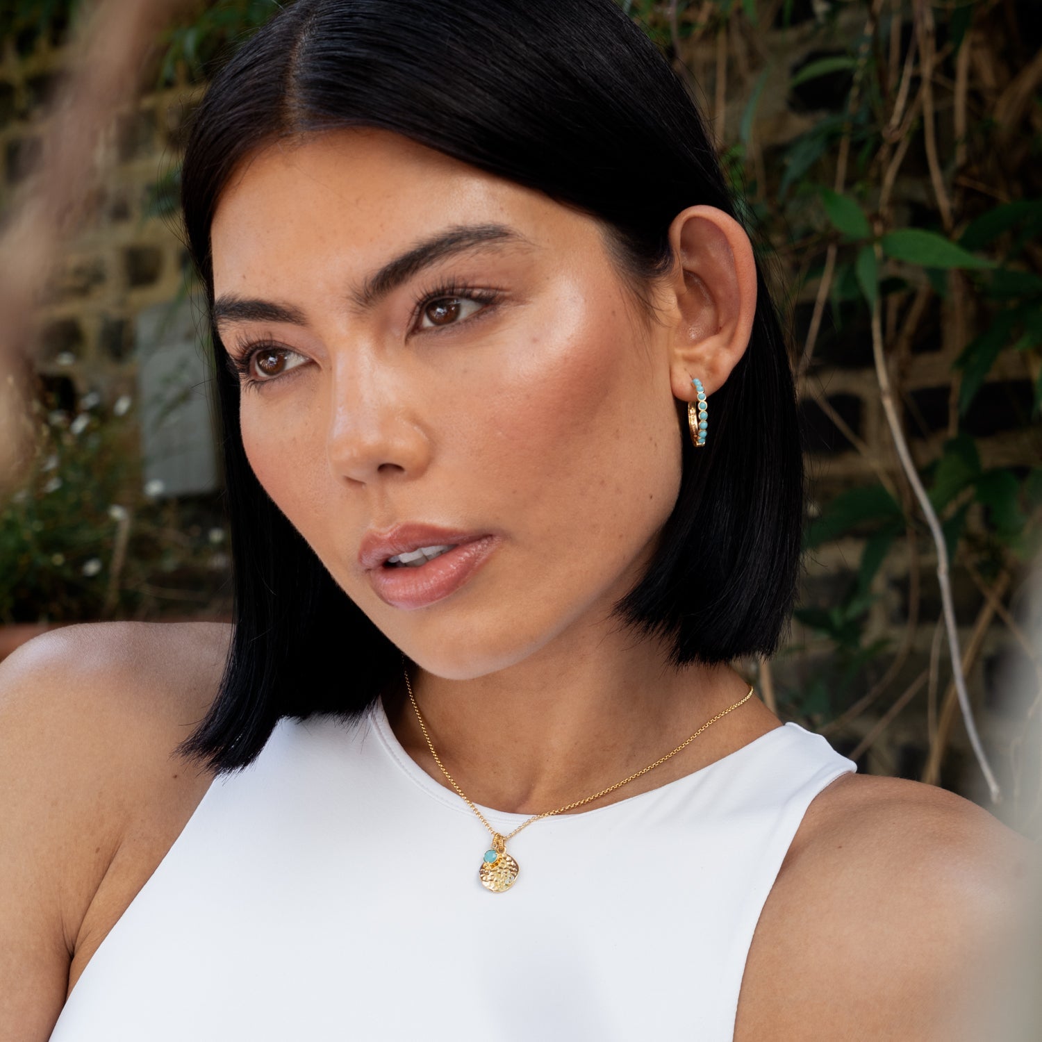 This Hammered Disc & Turquoise Array Pendant by Dower & Hall exudes understated elegance. It features a radiant turquoise gemstone encased in a rub-over setting, layered with a round disc bearing a hammered finish. The pendant is suspended on fine chain, completing the piece with our signature quatrefoil lobster catch. Available in both sterling silver and yellow gold vermeil finishes.