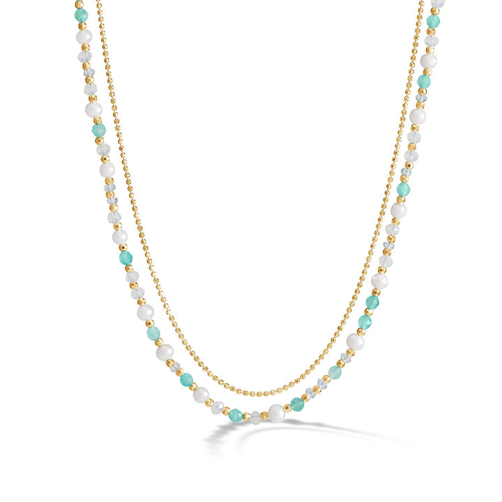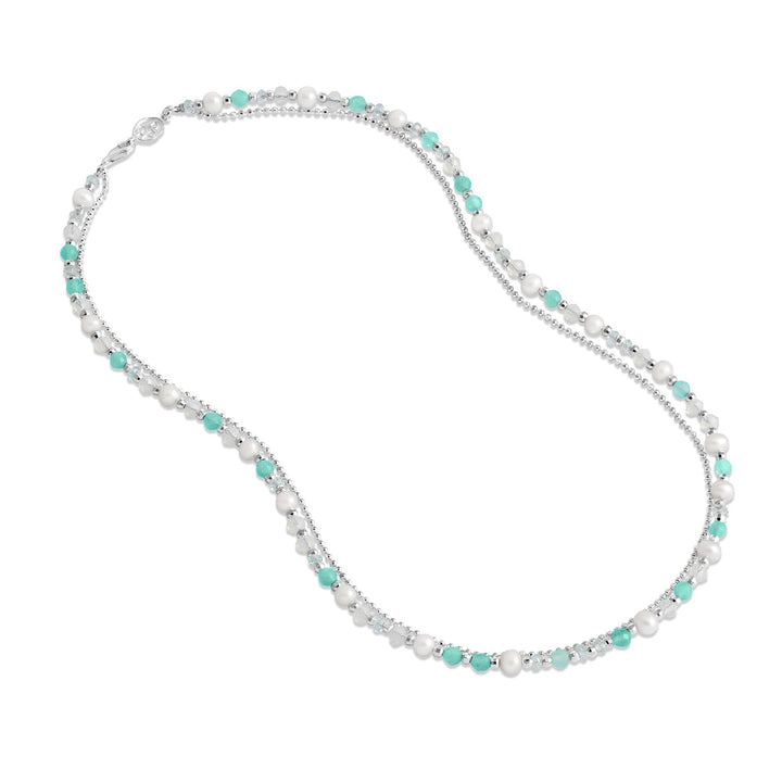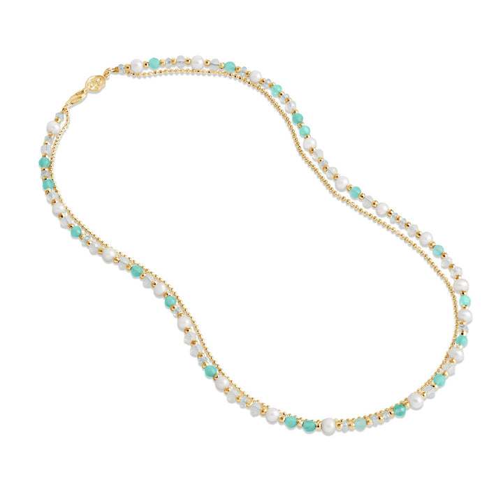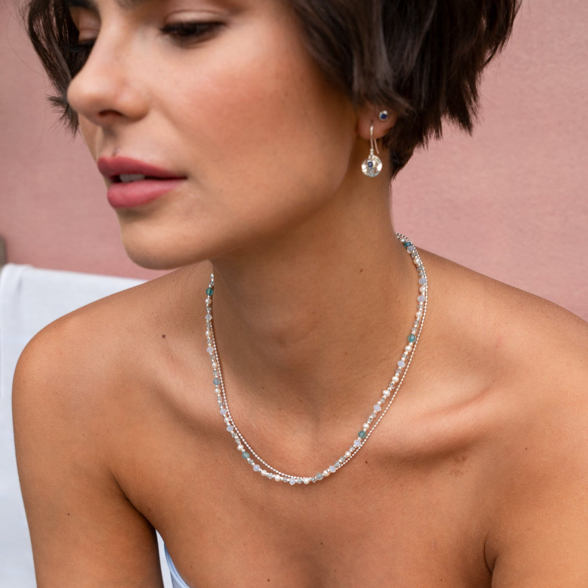 This Serenity Orissa Necklace by Dower & Hall combines soft blue hues from apatite, blue topaz, moonstone, and white pearl, creating a simple yet elegant style. The necklace is enhanced with yellow gold vermeil beads and a matching catch, making it a beautiful addition to any gemstone collection.