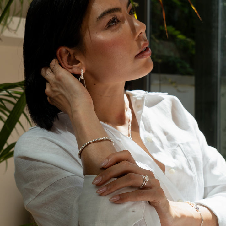 This Nomad Nuggets Bracelet by Dower & Hall features individual, irregular sterling silver Nomad nuggets threaded onto chain to create a unique bracelet. Available in both sterling silver and yellow gold vermeil finishes, this bracelet is great for layering.