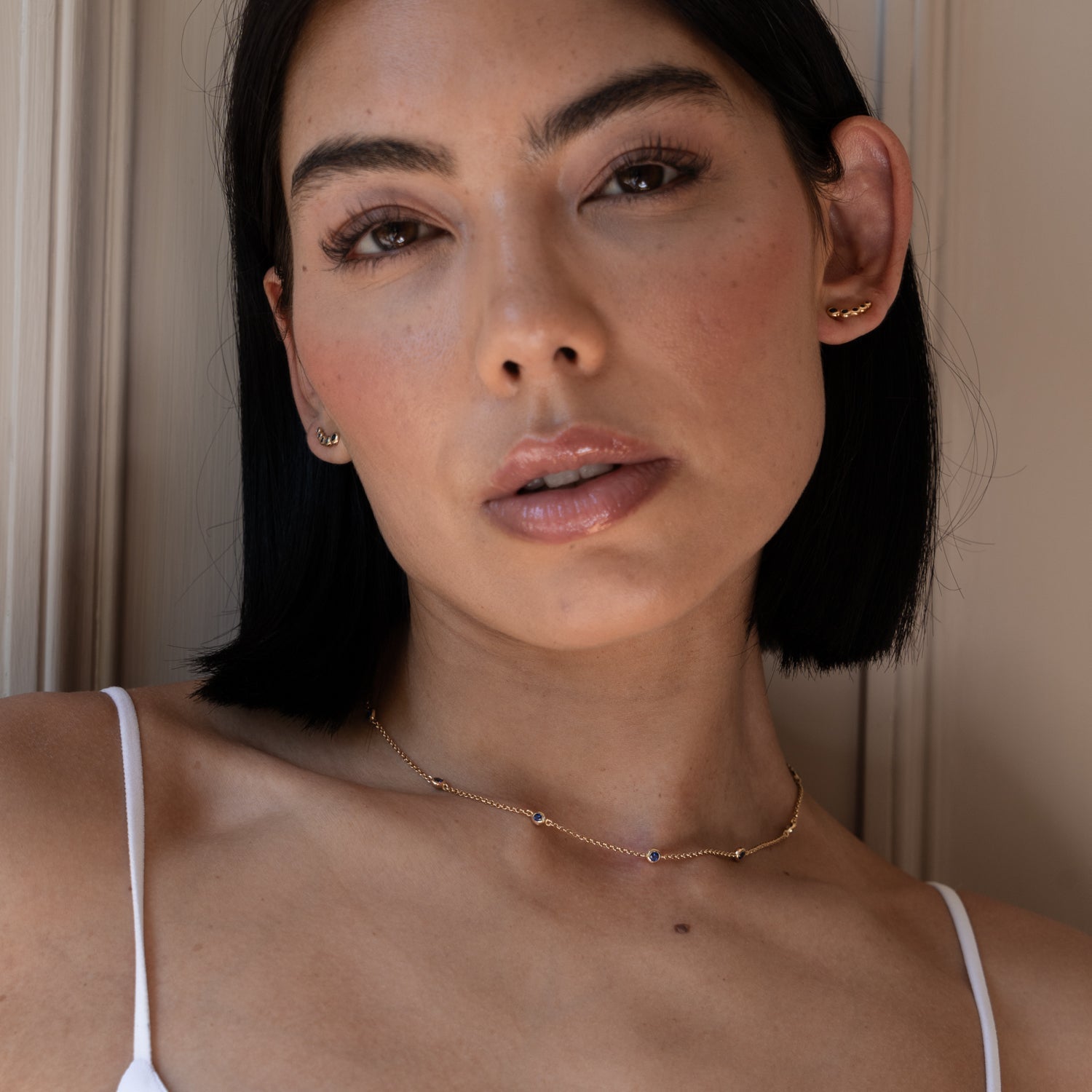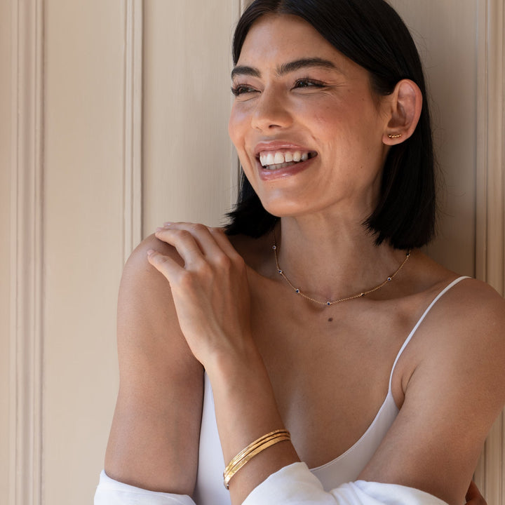 Available in sterling silver or 18ct yellow gold vermeil. Featuring 9 blue sapphires (3mm each) set in round settings, finished with a lobster catch.