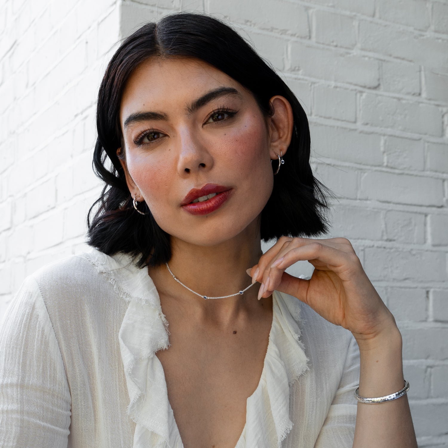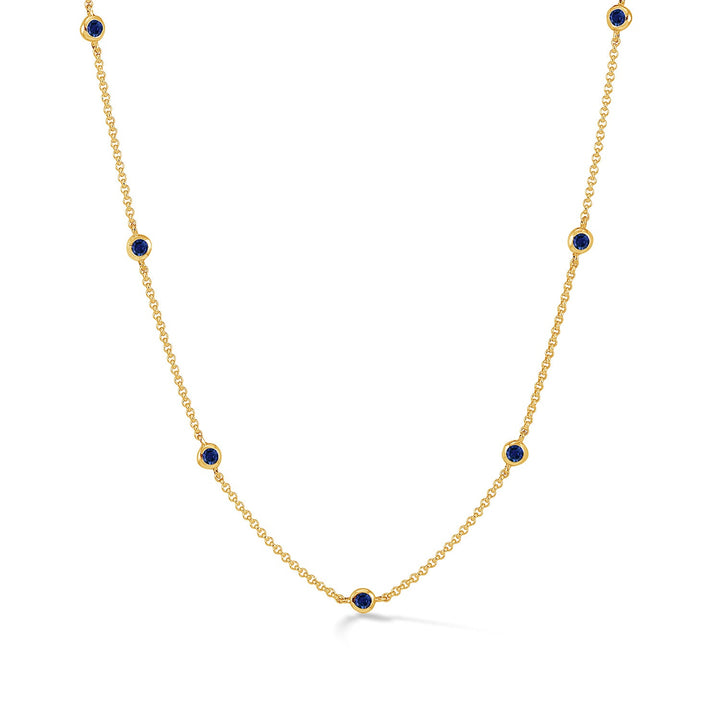This Blue Sapphire Dewdrop Chain Necklace by Dower & Hall features 9 deep blue sapphires encased in round settings along a delicate sterling silver chain. Made in the London studio, the necklace is finished with a signature lobster catch. Available in either sterling silver or yellow gold vermeil, this necklace brings a pop of color and elegance to any outfit.