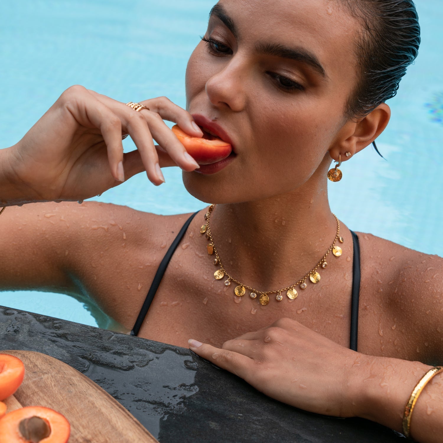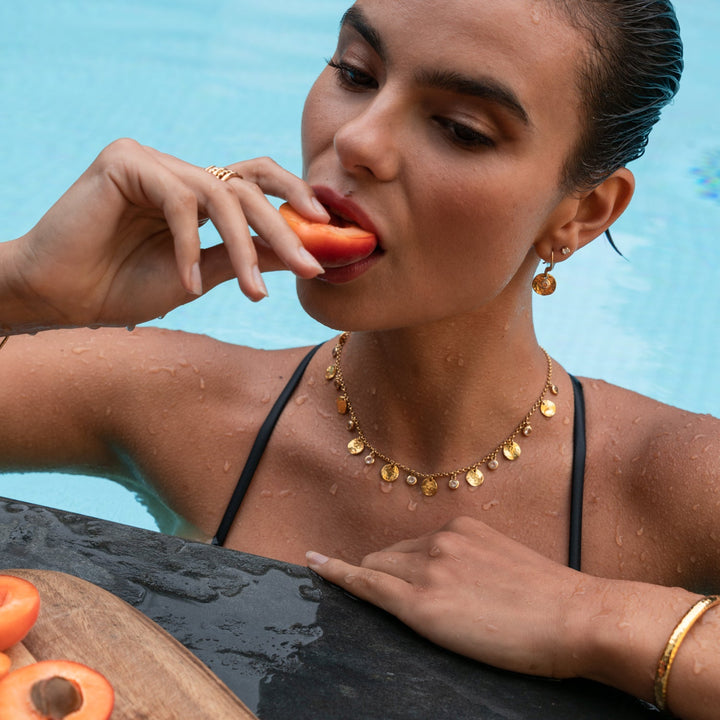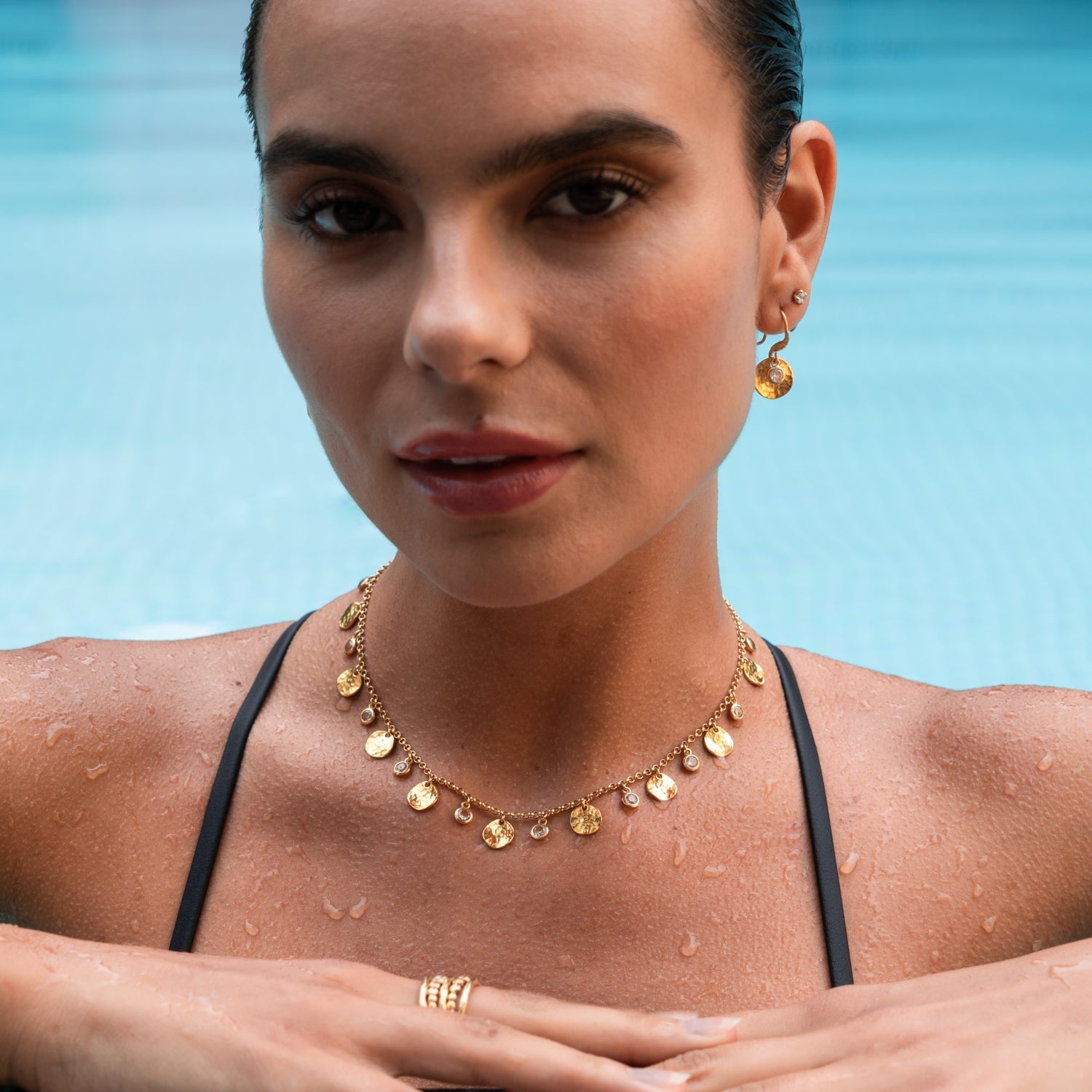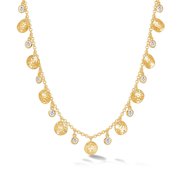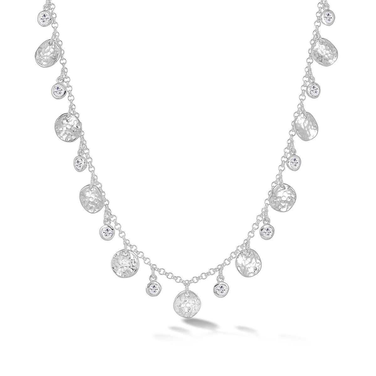 Handcrafted in sterling silver with white sapphires (4mm) and hammered discs (10mm). Finished with a hammered loop and t-bar. Available in sterling silver or 18ct yellow gold vermeil finish.