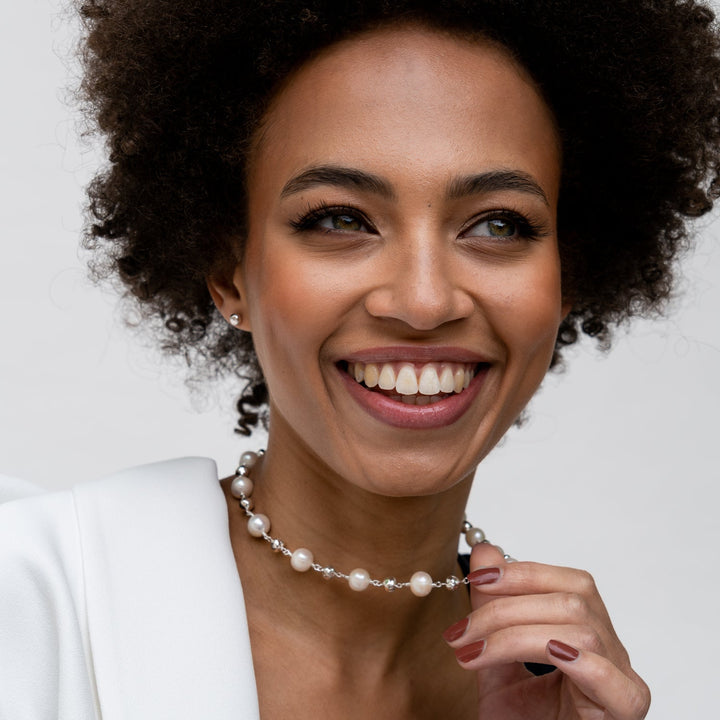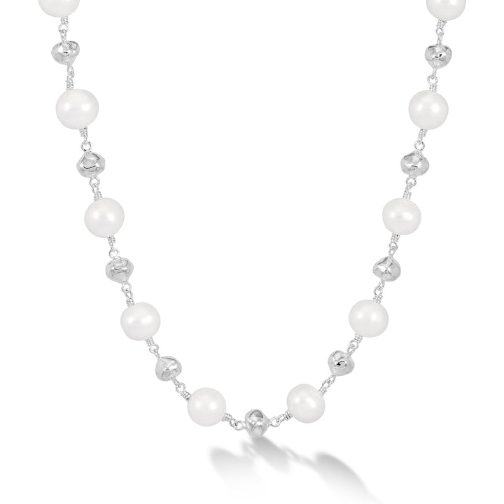 This Nugget & White Freshwater Pearl Necklace by Dower & Hall from the Luna Pearls range features white cultured freshwater pearls interspersed with 5mm sterling silver nuggets. The nuggets have a soft beaten finish, giving the necklace an organic yet contemporary feel. Finished with the brand’s signature beaten loop and t-bar catch, this necklace is perfect for adding a timeless elegance to any look.
