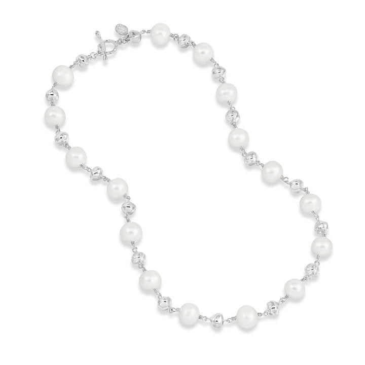 Handcrafted in sterling silver with 8-10mm white cultured freshwater pearls and 5mm sterling silver nuggets. Finished with a sterling silver beaten loop and t-bar catch.