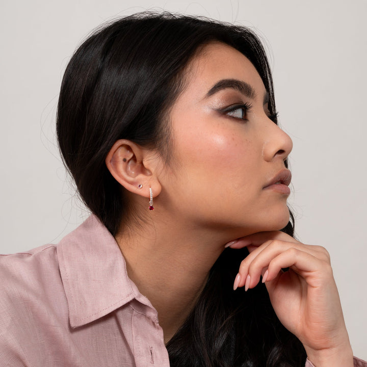 Available in sterling silver or 18ct yellow gold vermeil. Featuring a 4mm garnet gemstone set in a lotus bud charm drop. Hoop size - 15mm.