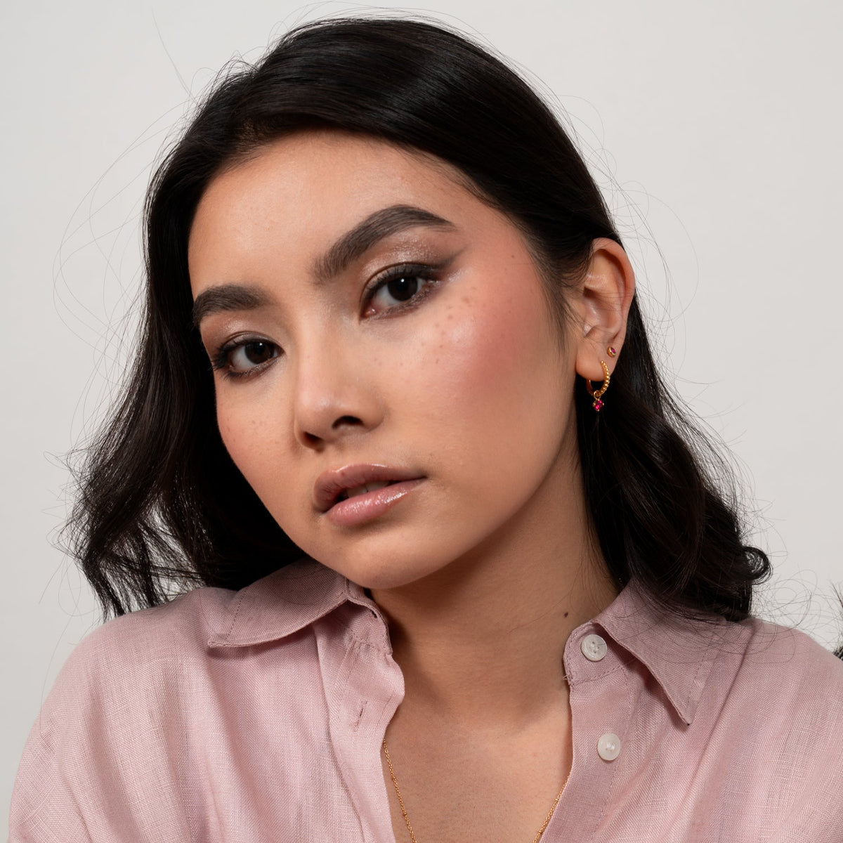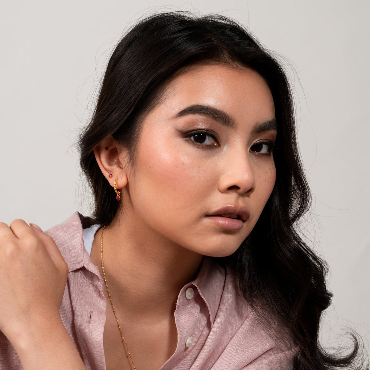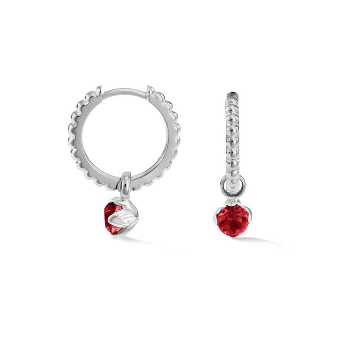 These Garnet Orissa Hoops by Dower & Hall feature a signature dotty texture and a lotus bud charm drop set with a vibrant garnet gemstone. Available in sterling silver or with a luxurious 18ct yellow gold vermeil finish, these hoops bring a pop of color and sophistication to any look.