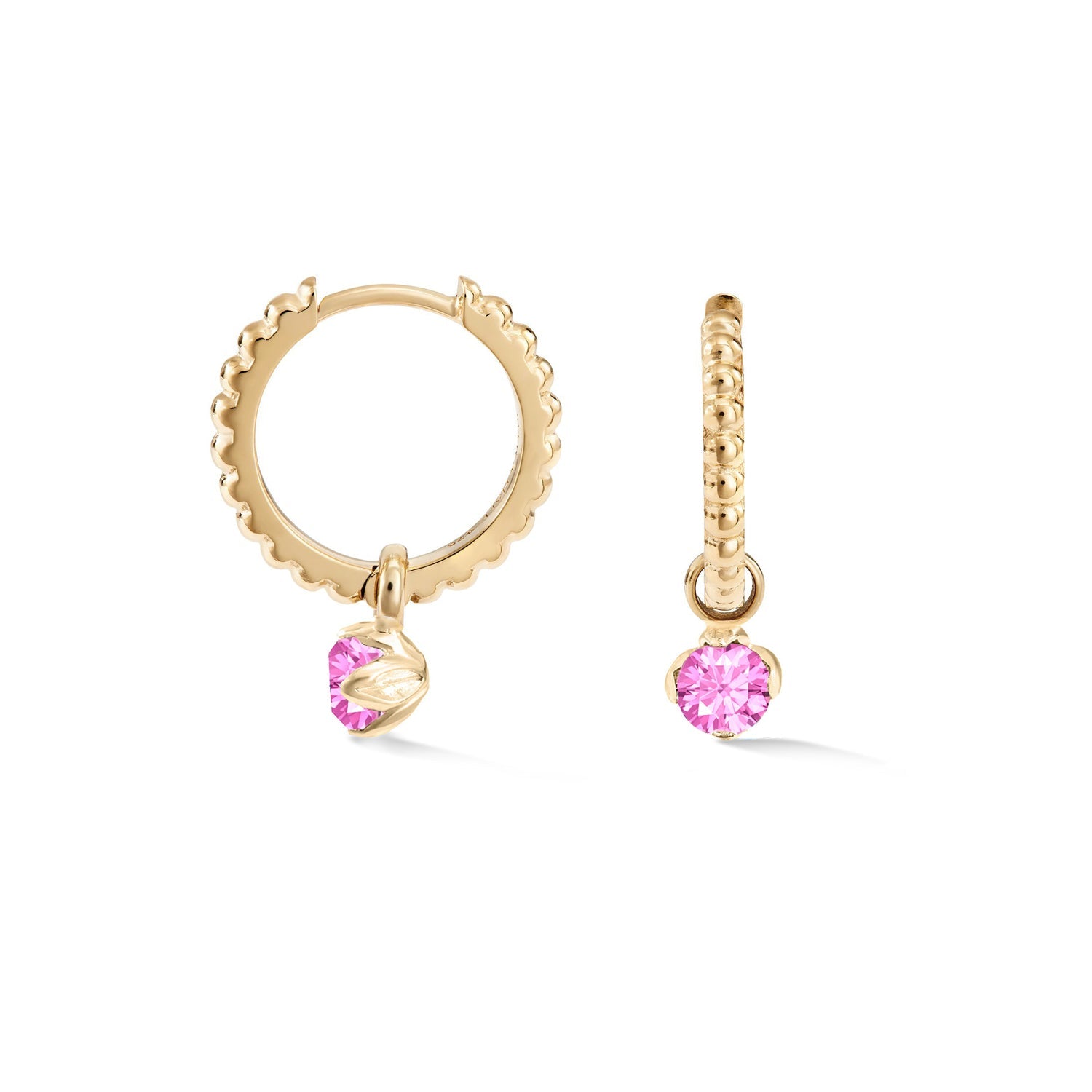 These Pink Tourmaline Orissa Hoops by Dower & Hall offer a unique design with a signature dotty texture and a lotus bud charm drop set with a pink tourmaline gemstone. Available in sterling silver or with a radiant 18ct yellow gold vermeil finish, these hoops are perfect for those who enjoy distinctive and eye-catching jewelry.