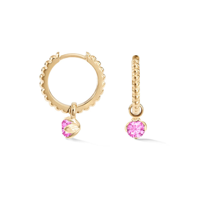 Available in sterling silver or 18ct yellow gold vermeil. Featuring a pink tourmaline gemstone (4mm) set in a lotus bud charm drop with a hinged huggie hoop design. Hoop size - 15mm.