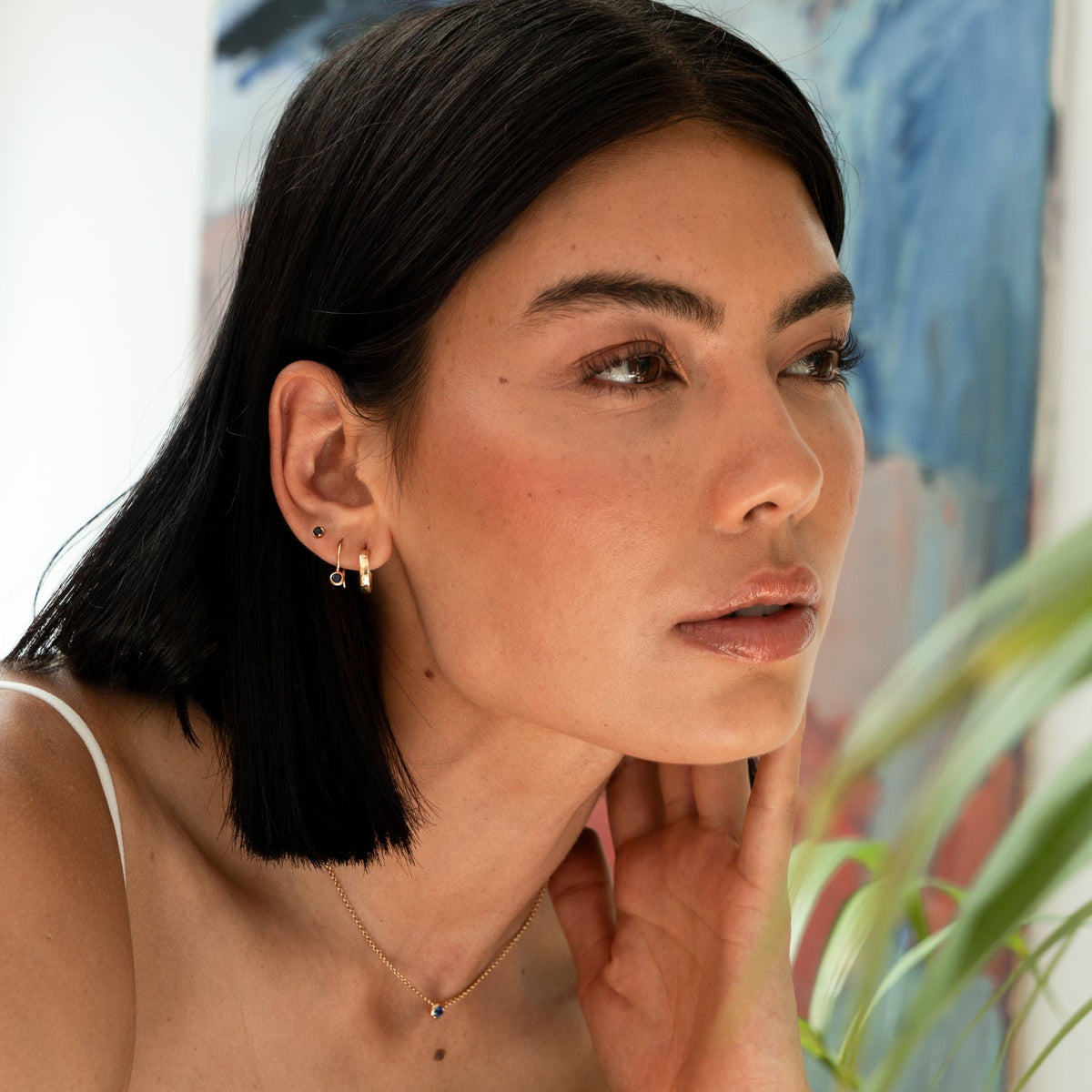 Made from sterling silver with 18ct yellow gold vermeil finish, featuring 3mm blue sapphires. Total length: 14mm.