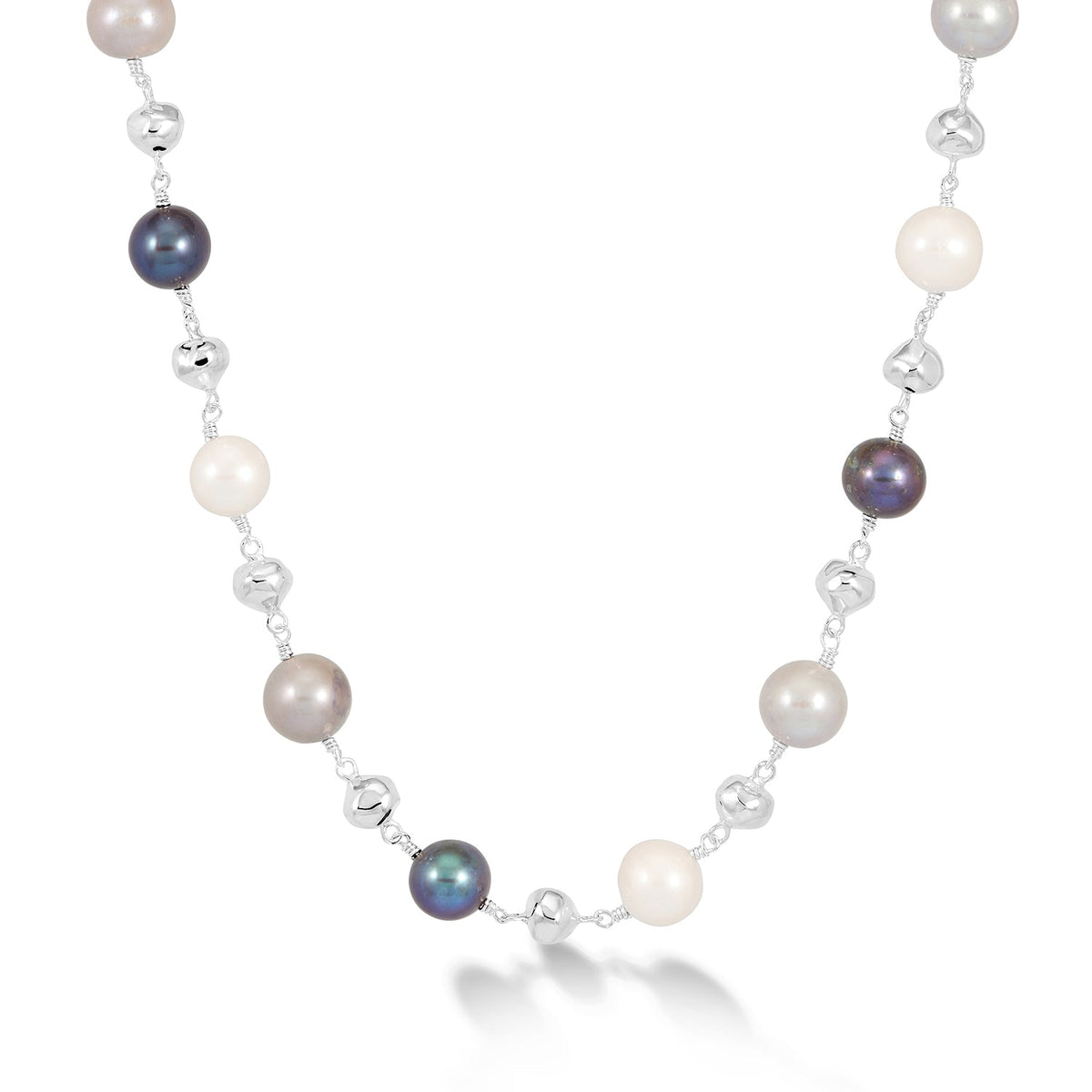 This Nugget & Mixed Freshwater Pearl Necklace by Dower & Hall from the Luna Pearls range combines mixed white, dove grey, and peacock cultured freshwater pearls with 7 sterling silver nuggets. The soft beaten finish on the 5mm nuggets gives the necklace an organic yet contemporary feel, making it a versatile piece for any occasion. Finished with a signature beaten loop and t-bar catch.