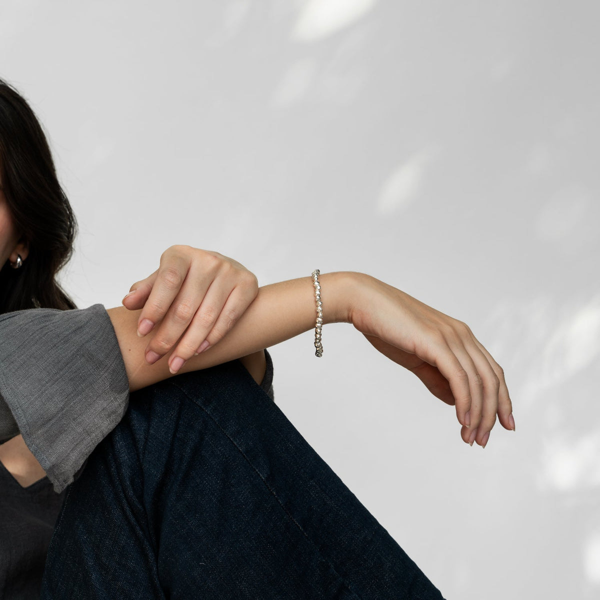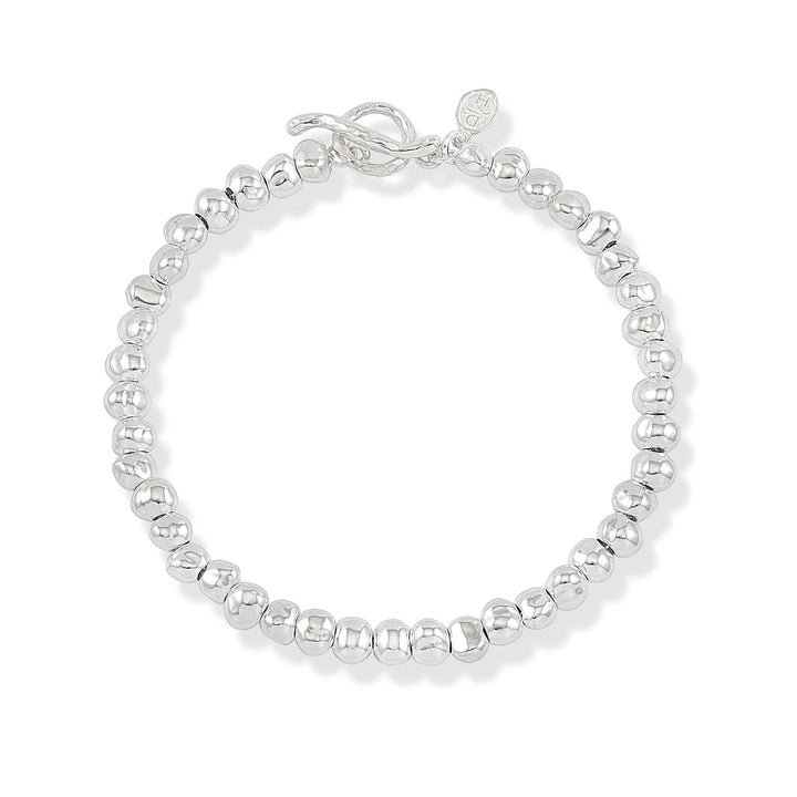 This Chunky Signature Nugget Bracelet by Dower & Hall is a striking piece made from medium-sized sterling silver nuggets threaded onto a silver chain. Finished with a hammered circle and t-bar clasp, this bracelet is a timeless classic that will complement any jewelry collection.