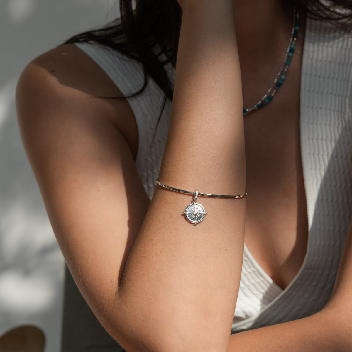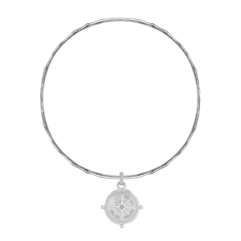 Handcrafted in recycled sterling silver with a True North compass charm. Bangle width: 2mm, featuring the brand’s signature hammered finish.