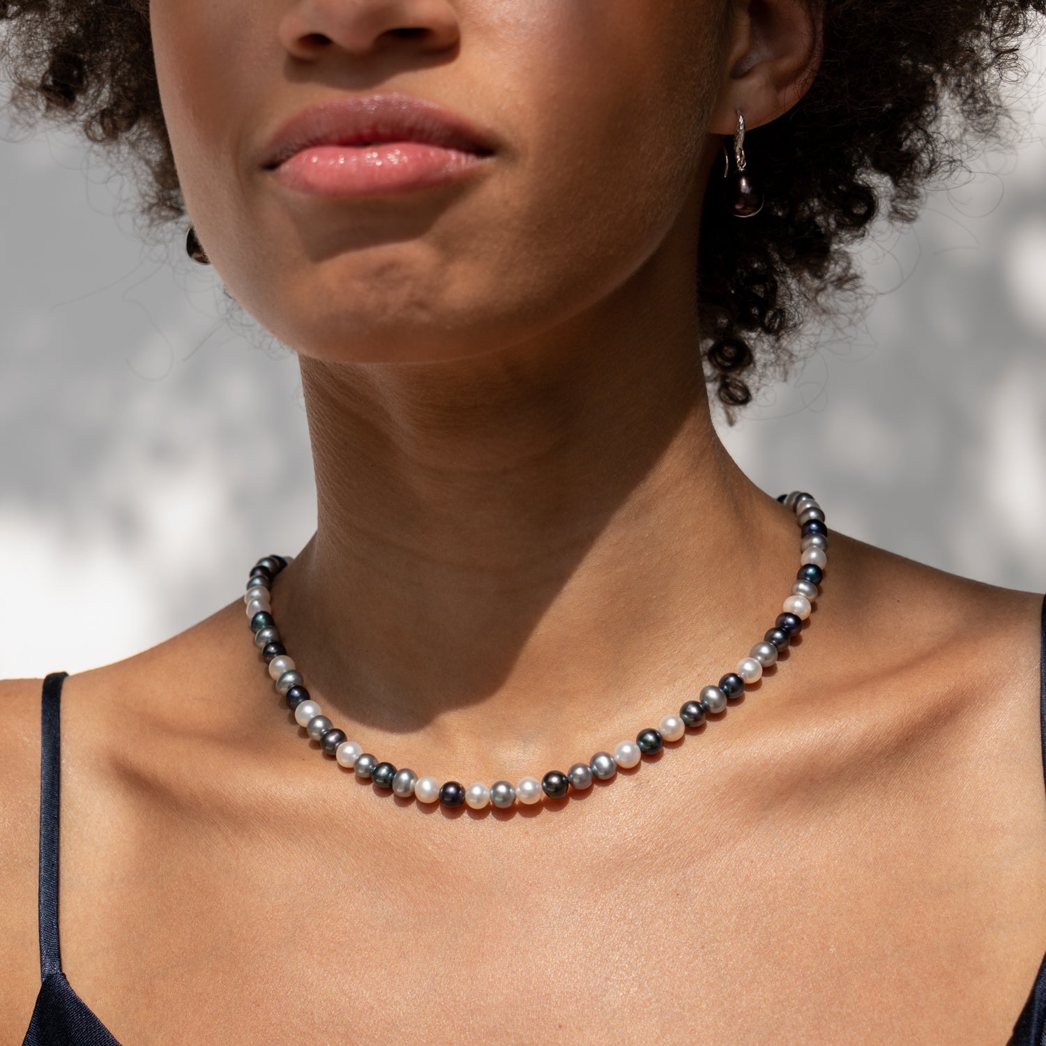 This Timeless Mixed Freshwater Pearl Necklace by Dower & Hall features a mix of 6mm peacock, dove grey, and white cultured freshwater pearls, offering a sophisticated and elegant touch to any outfit. The necklace is finished with the brand’s signature sterling silver beaten loop and t-bar catch, making it a timeless essential for day or night wear.