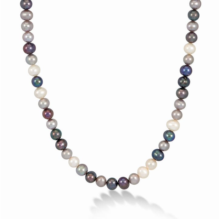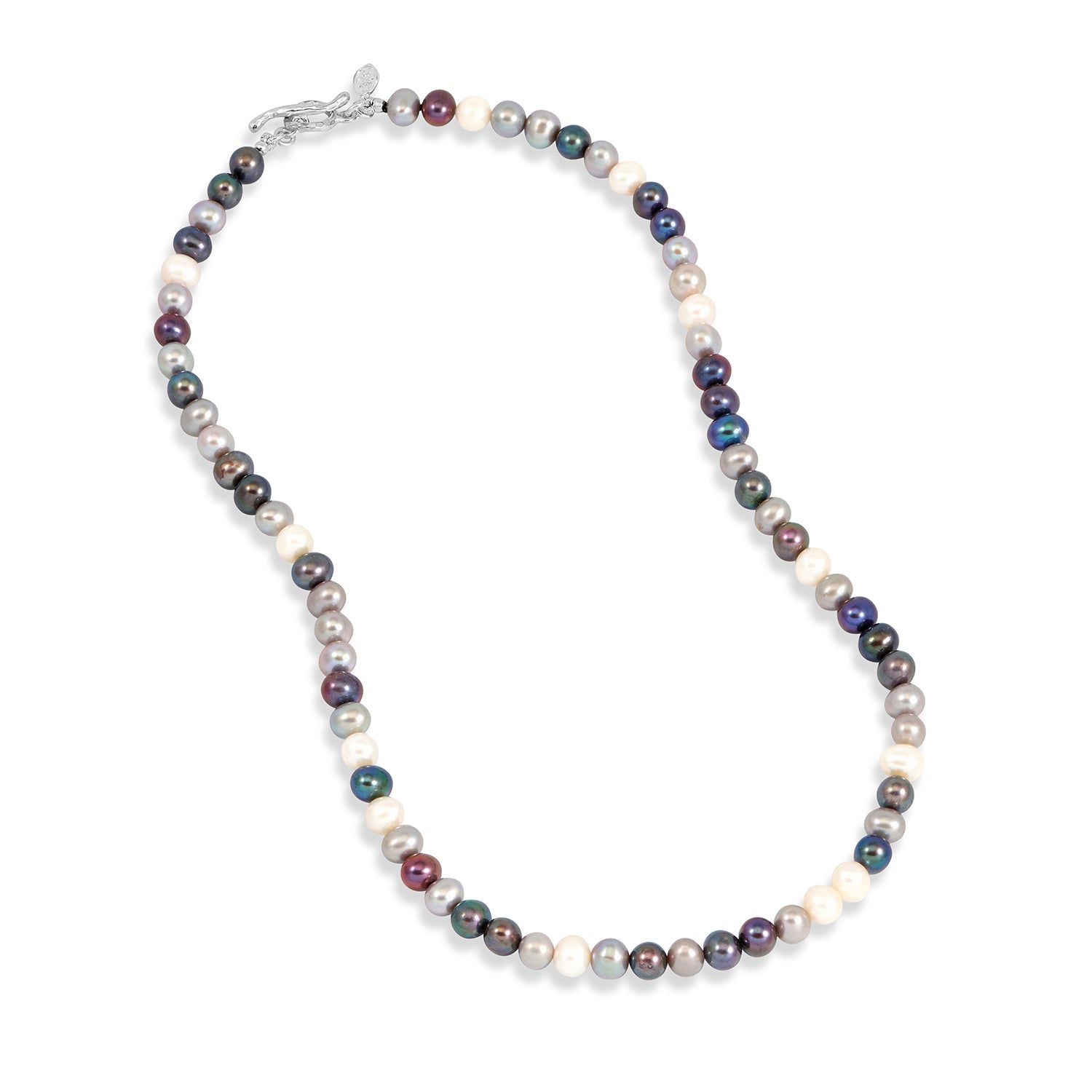 Handcrafted in sterling silver with 6mm mixed peacock, dove grey, and white cultured freshwater pearls. Finished with a sterling silver beaten loop and t-bar catch.