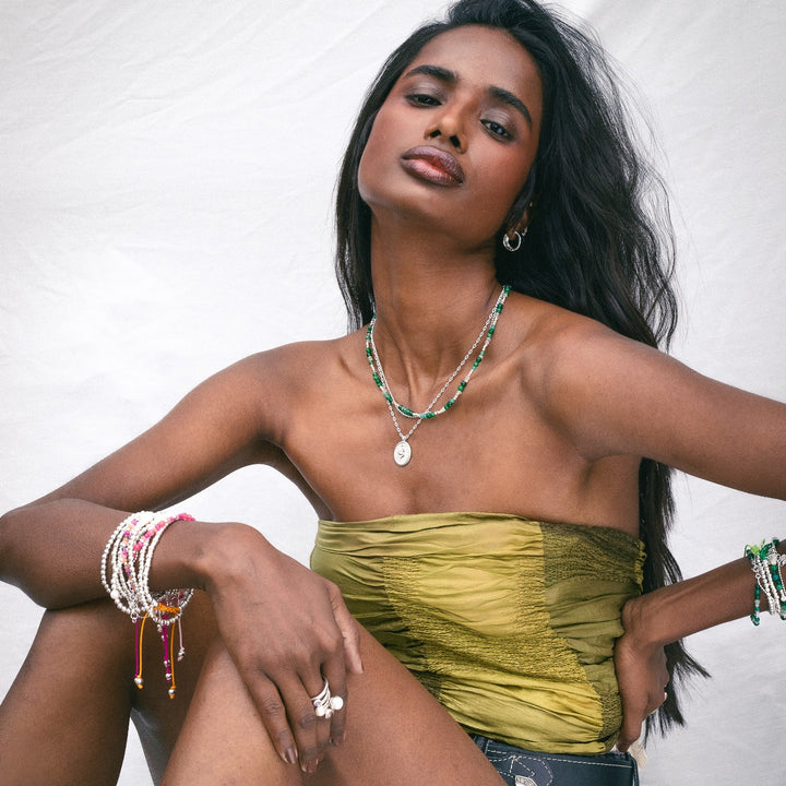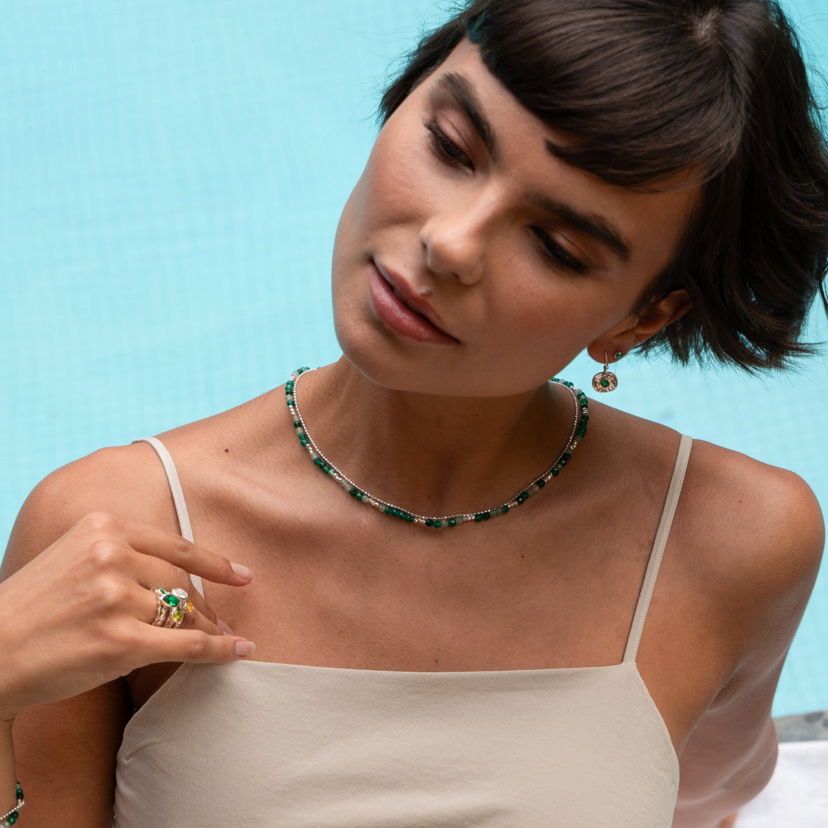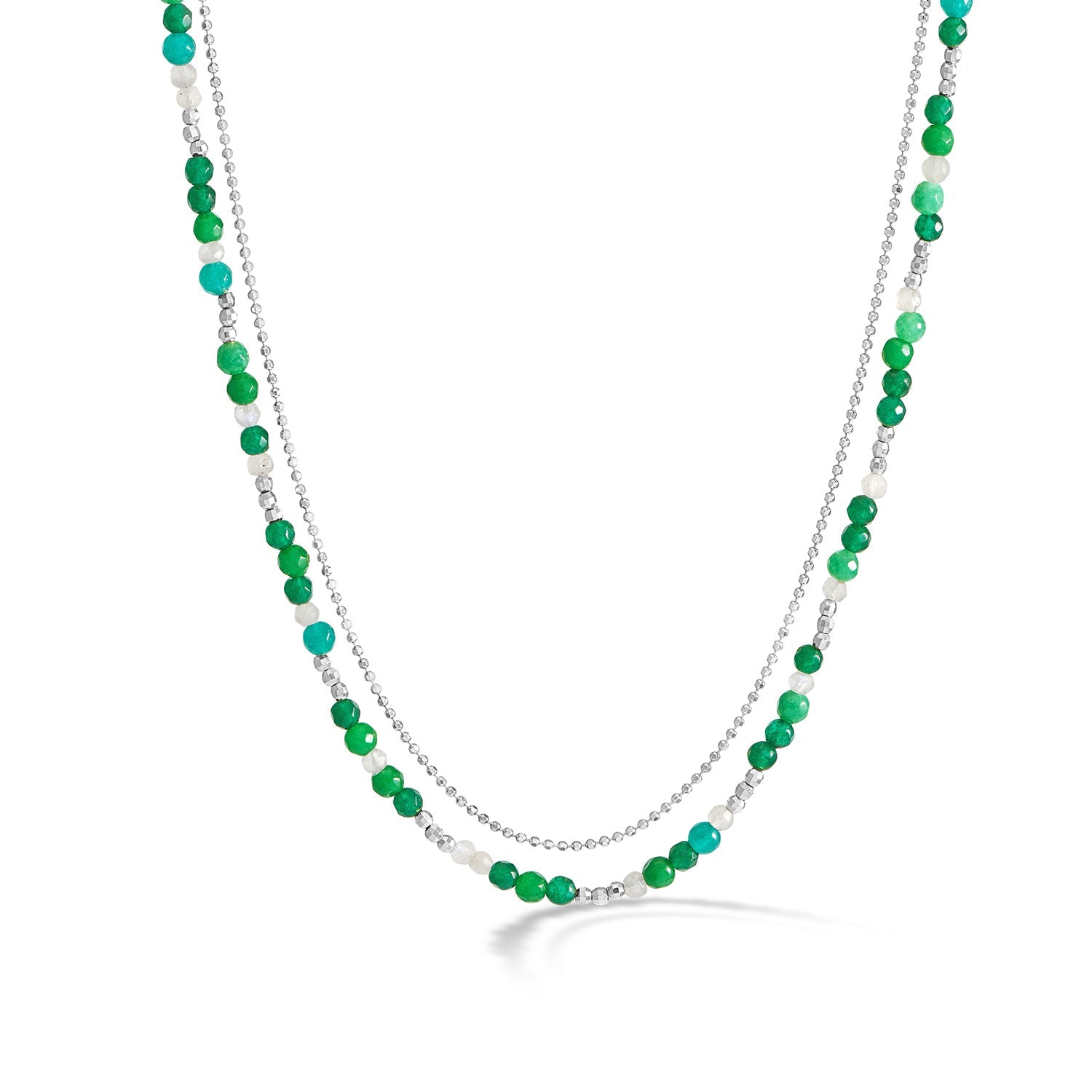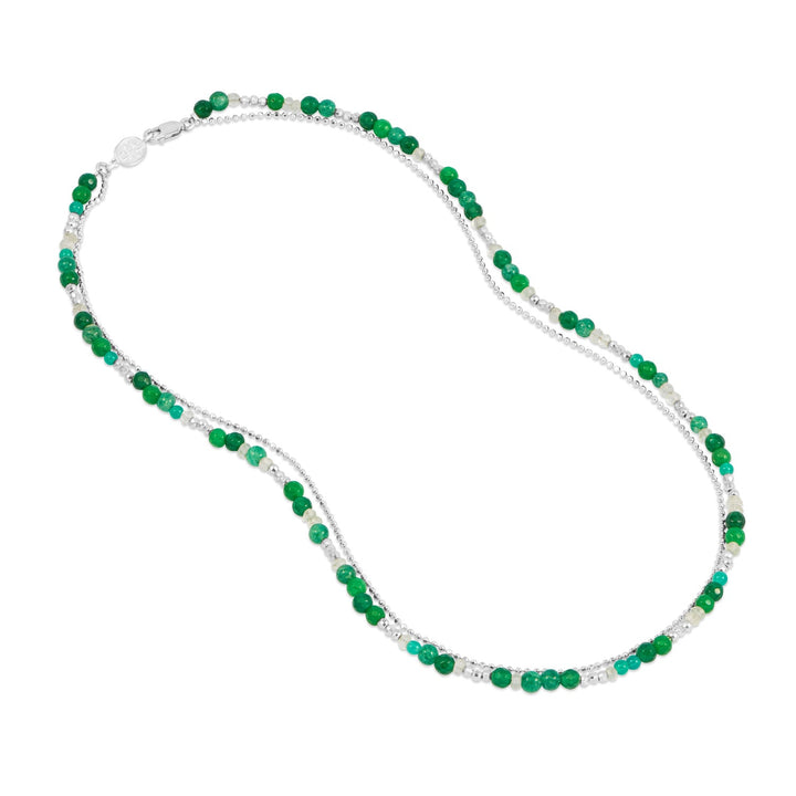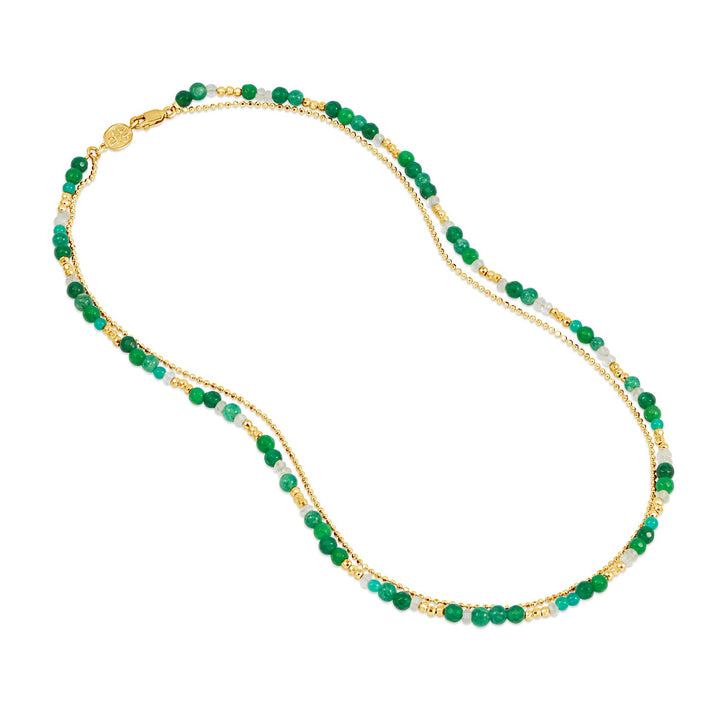 This Evergreen Orissa Necklace by Dower & Hall features a combination of amazonite, green agate, and moonstone gemstones, complemented by shimmering beads. It is available in both sterling silver and radiant yellow gold vermeil finishes, perfect for any gemstone collection.