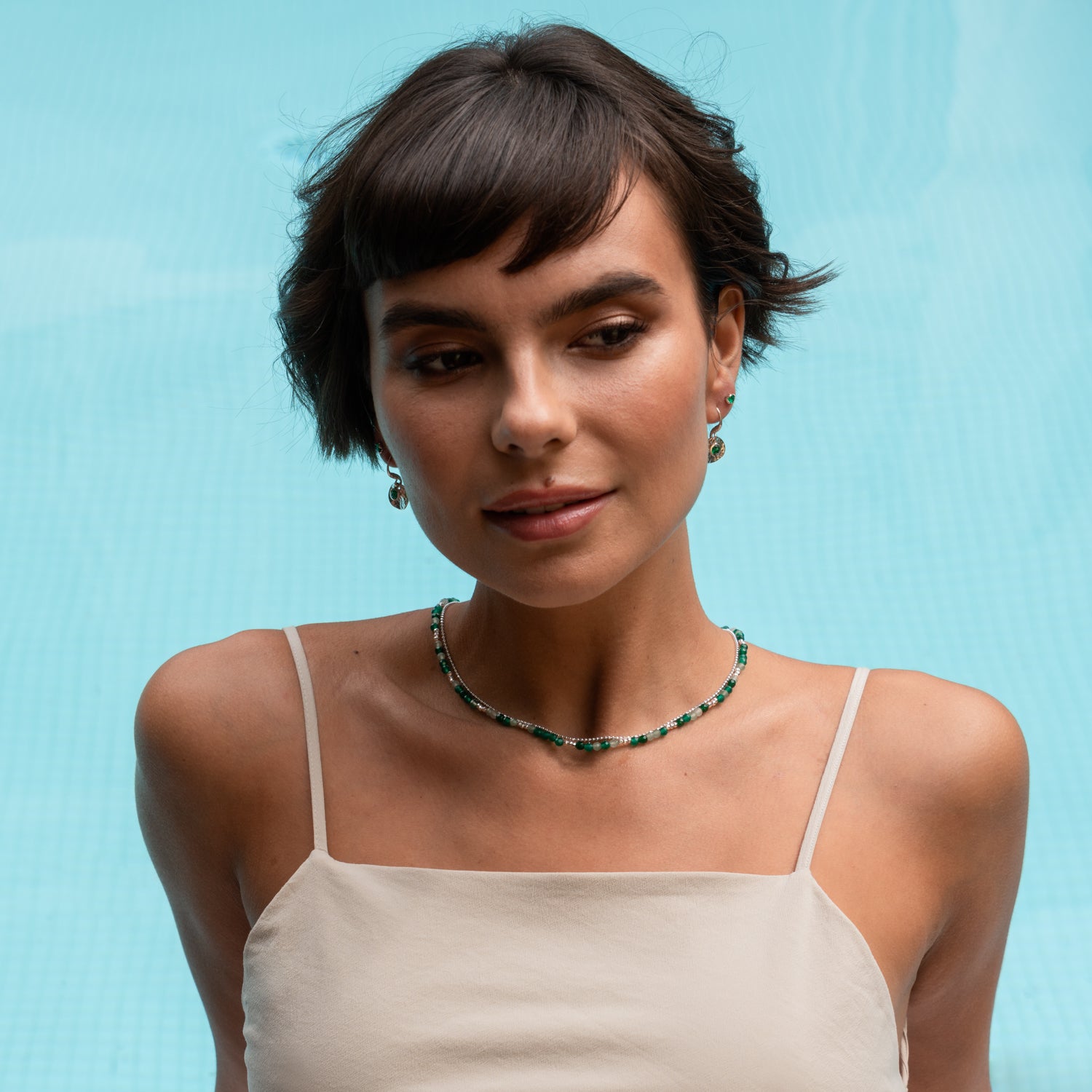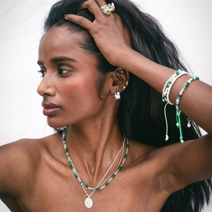 Sterling silver or 18ct yellow gold vermeil. Amazonite, green agate, and moonstone (gemstone sizes: 3-4mm).