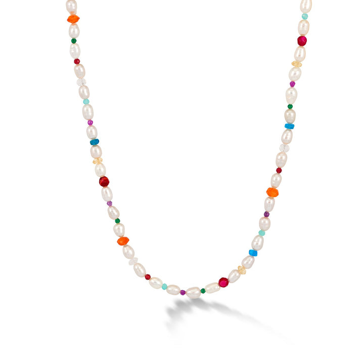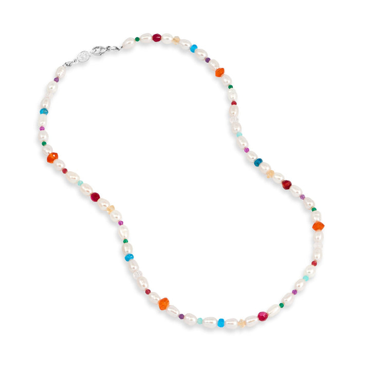 This Carnival Mixed Gemstone Necklace by Dower & Hall brings the spirit of summer to life, no matter the season. Handcrafted in the London studio, the vibrant combination of mixed gemstone beads in shades of the rainbow is paired with lustrous white freshwater pearls. Perfect for those who love a playful, lively aesthetic, this necklace radiates positive energy and joy. Its signature sterling silver hammered loop and t-bar catch add a refined touch to this fun piece.