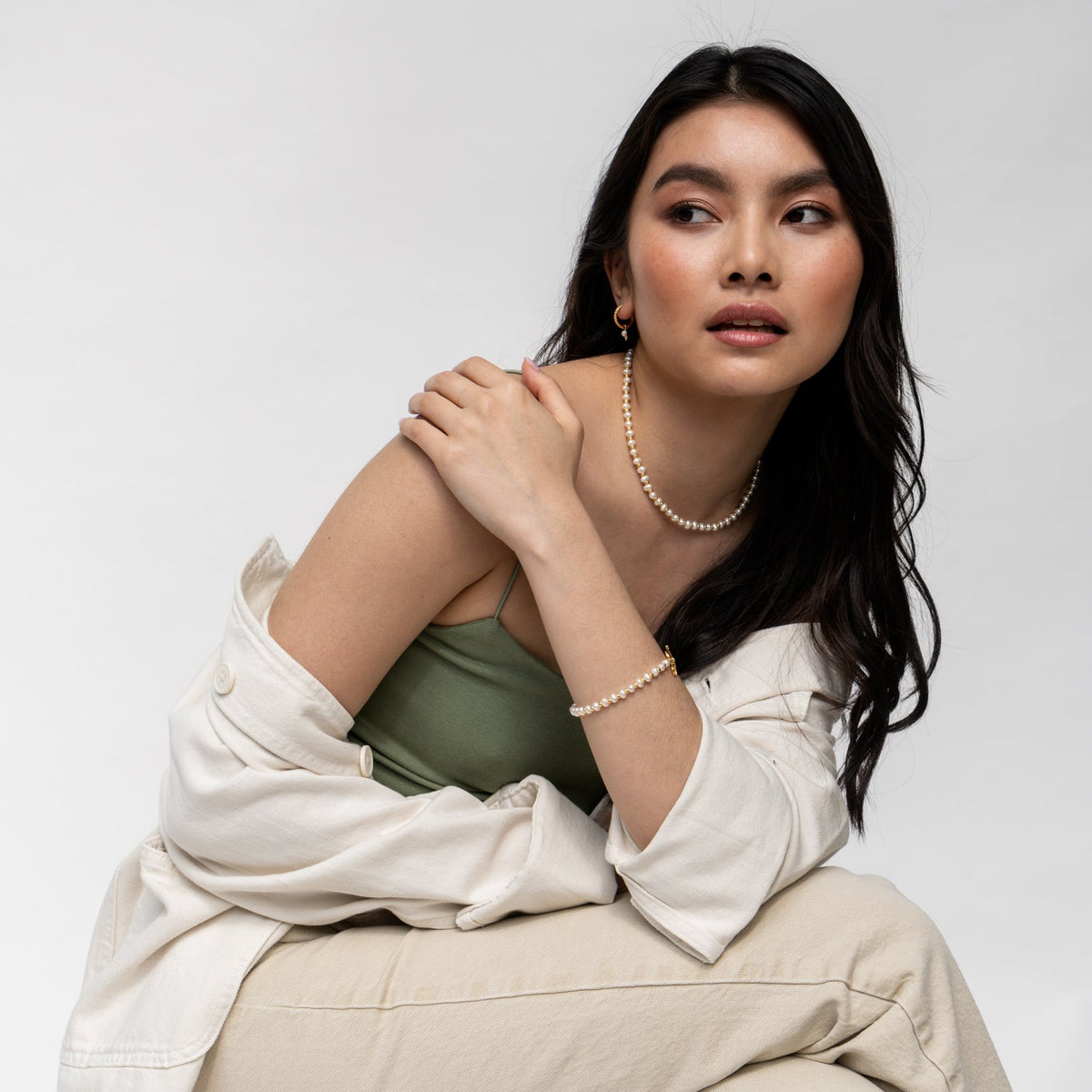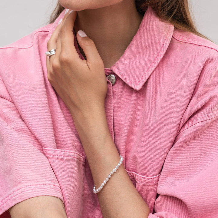This Timeless White Pearl Halo Bracelet by Dower & Hall features a mix of lustrous white freshwater pearls and sterling silver beads, making it a perfect piece to layer with other bracelets. Handmade in our London studio, it’s finished with a signature hammered circle and t-bar catch. Available in three sizes, this bracelet will seamlessly blend into your collection of timeless essentials.