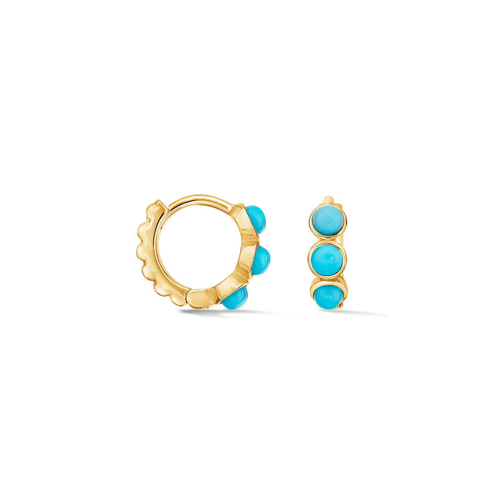 These Small Azure Turquoise Huggie Hoops by Dower & Hall are perfect for adding a hint of color and shimmer to any outfit. Set with vibrant turquoise gemstones, they are available in both sterling silver and 18ct yellow gold vermeil finishes. Ideal for smaller lobes or second piercings.