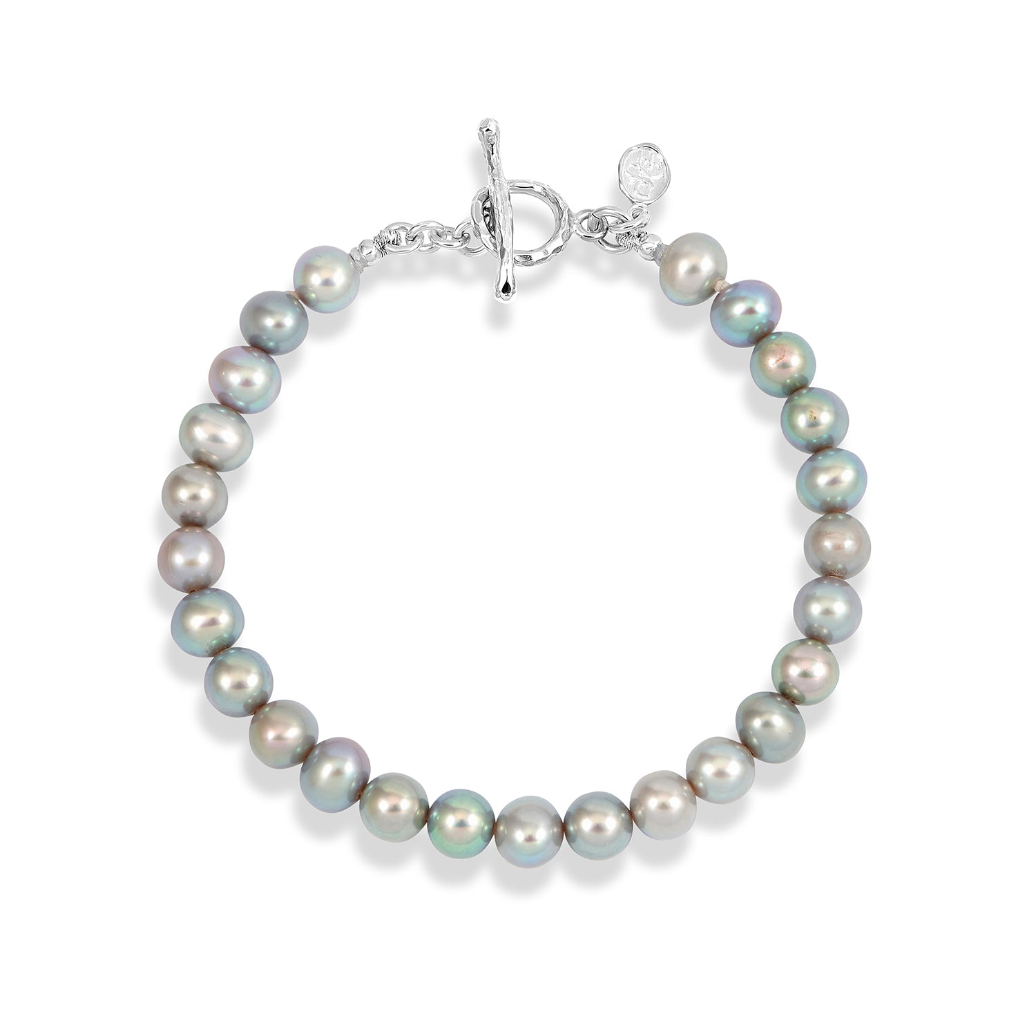 Handcrafted in sterling silver with 6mm dove grey cultured freshwater pearls. Finished with a sterling silver beaten loop and t-bar catch. Available in sizes S (7.25 inches), M (7.50 inches), and L (8 inches).