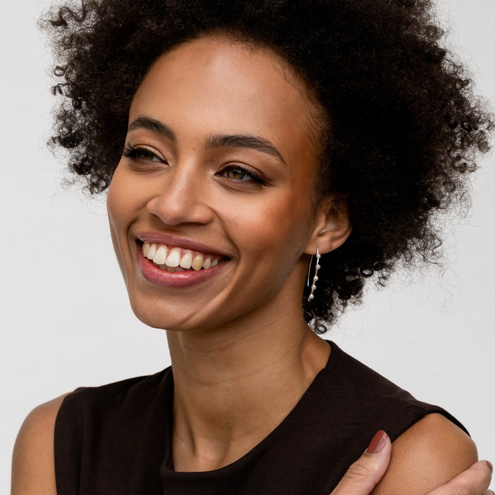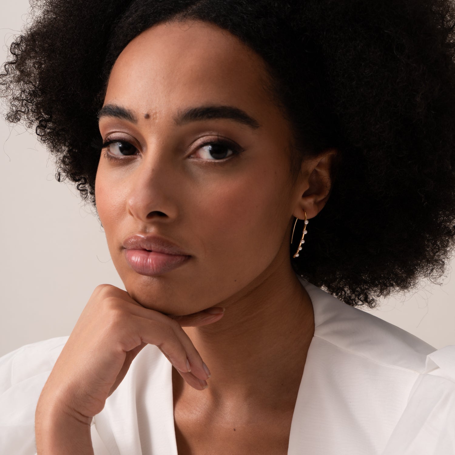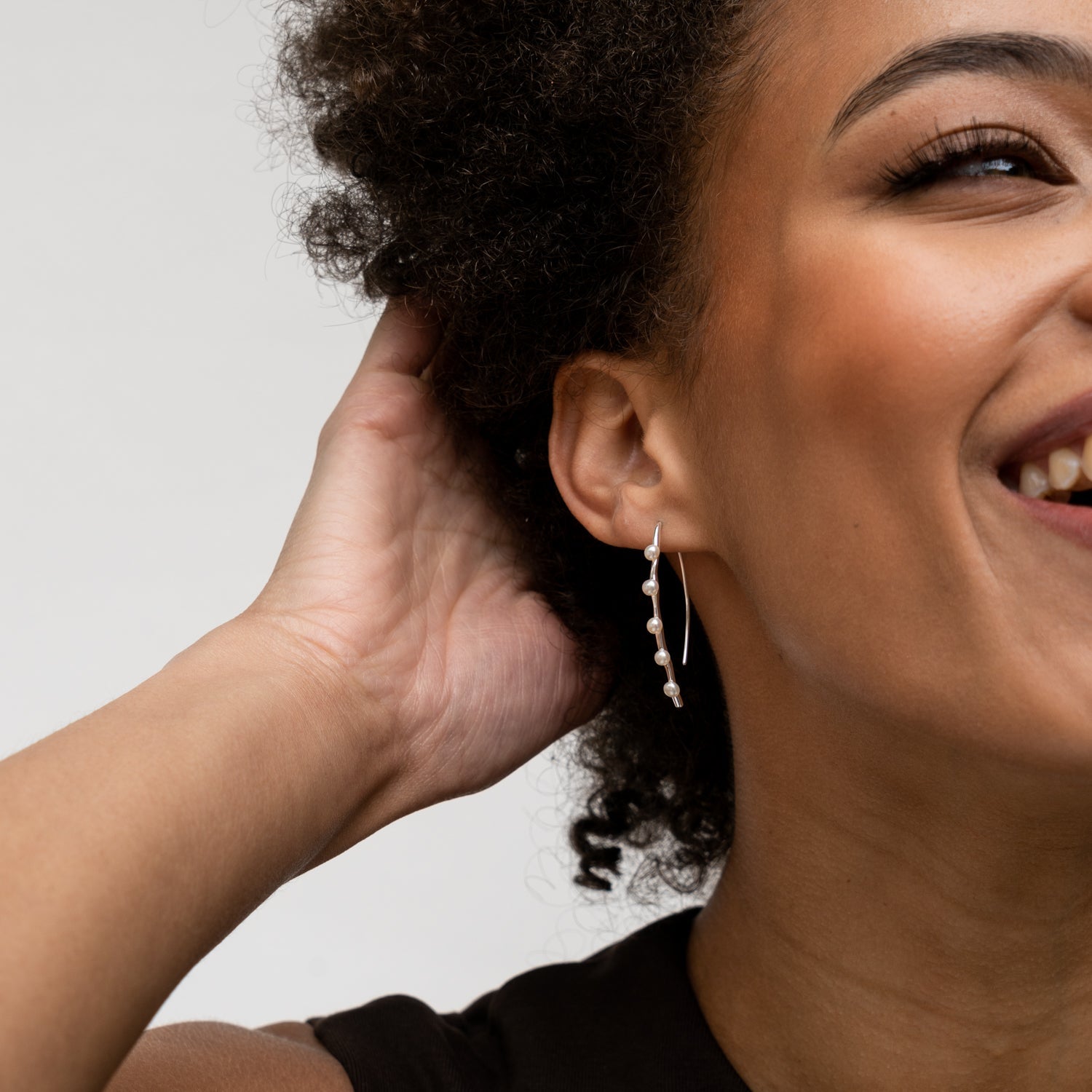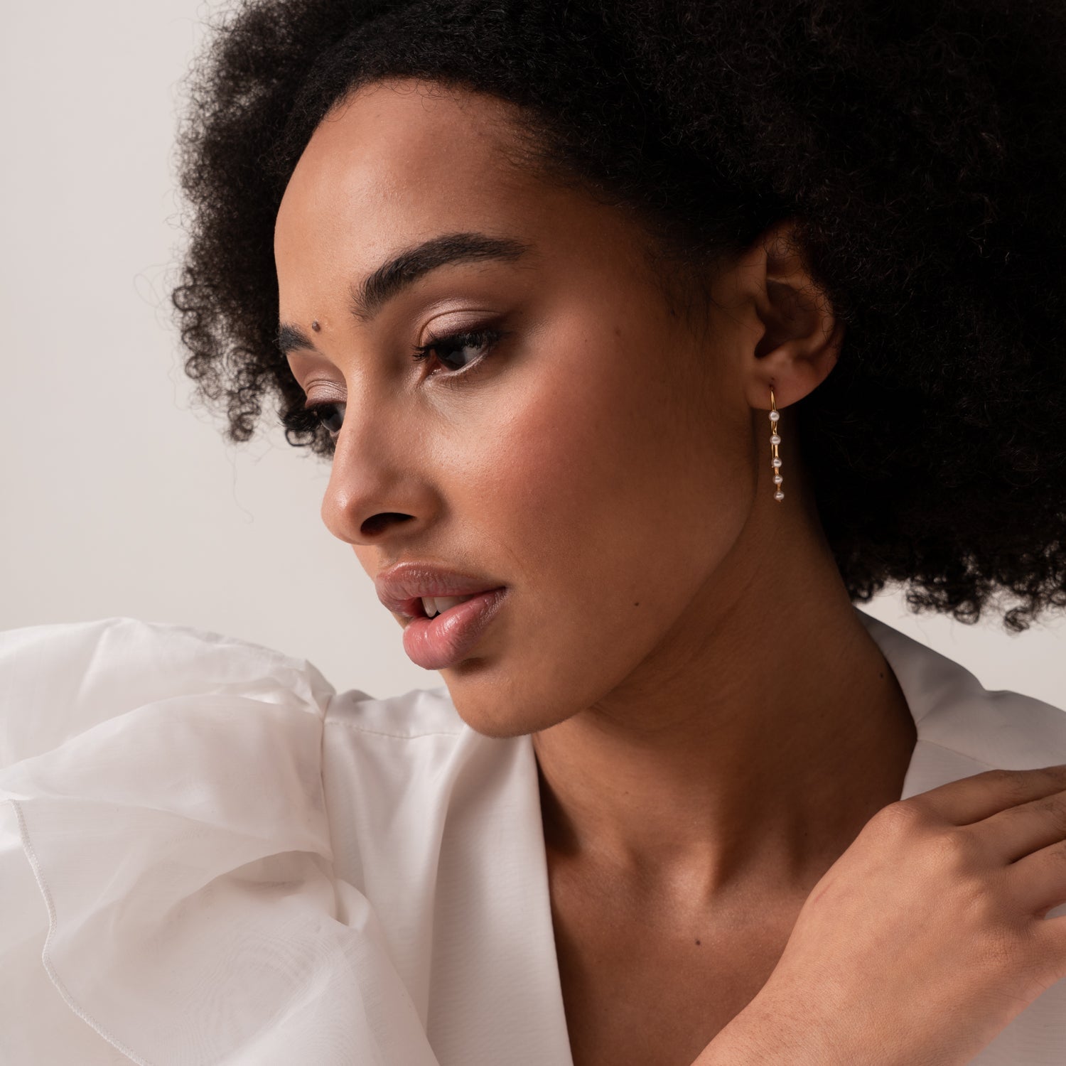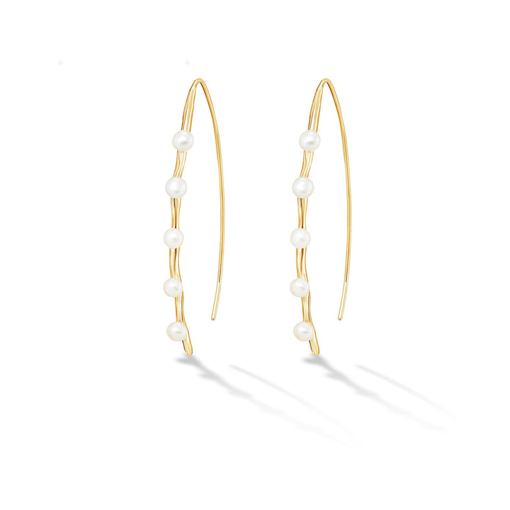 These Short Waterfall Pearl Drop Earrings by Dower & Hall showcase a timeless and refined design, featuring 10 delicate white freshwater pearls set on sterling silver. The pearls gracefully drop, creating a waterfall effect that adds elegance to any look. The 18ct yellow gold vermeil finish enhances the luxurious feel of these earrings, making them perfect for both casual and formal occasions. Their versatile, minimalist style ensures they pair effortlessly with a variety of outfits.