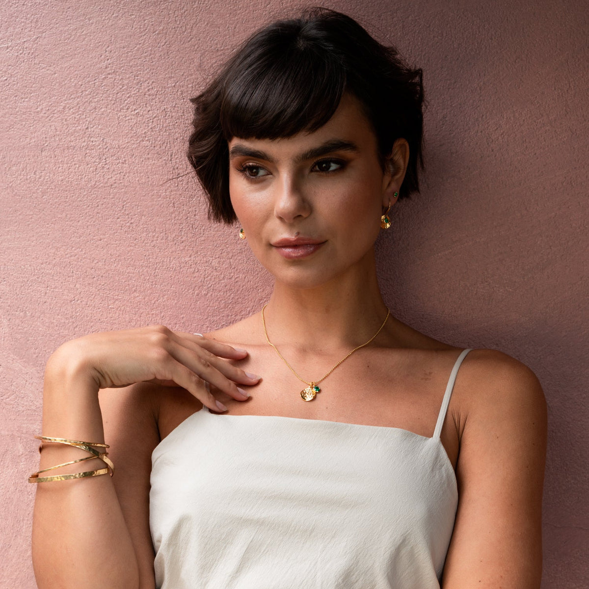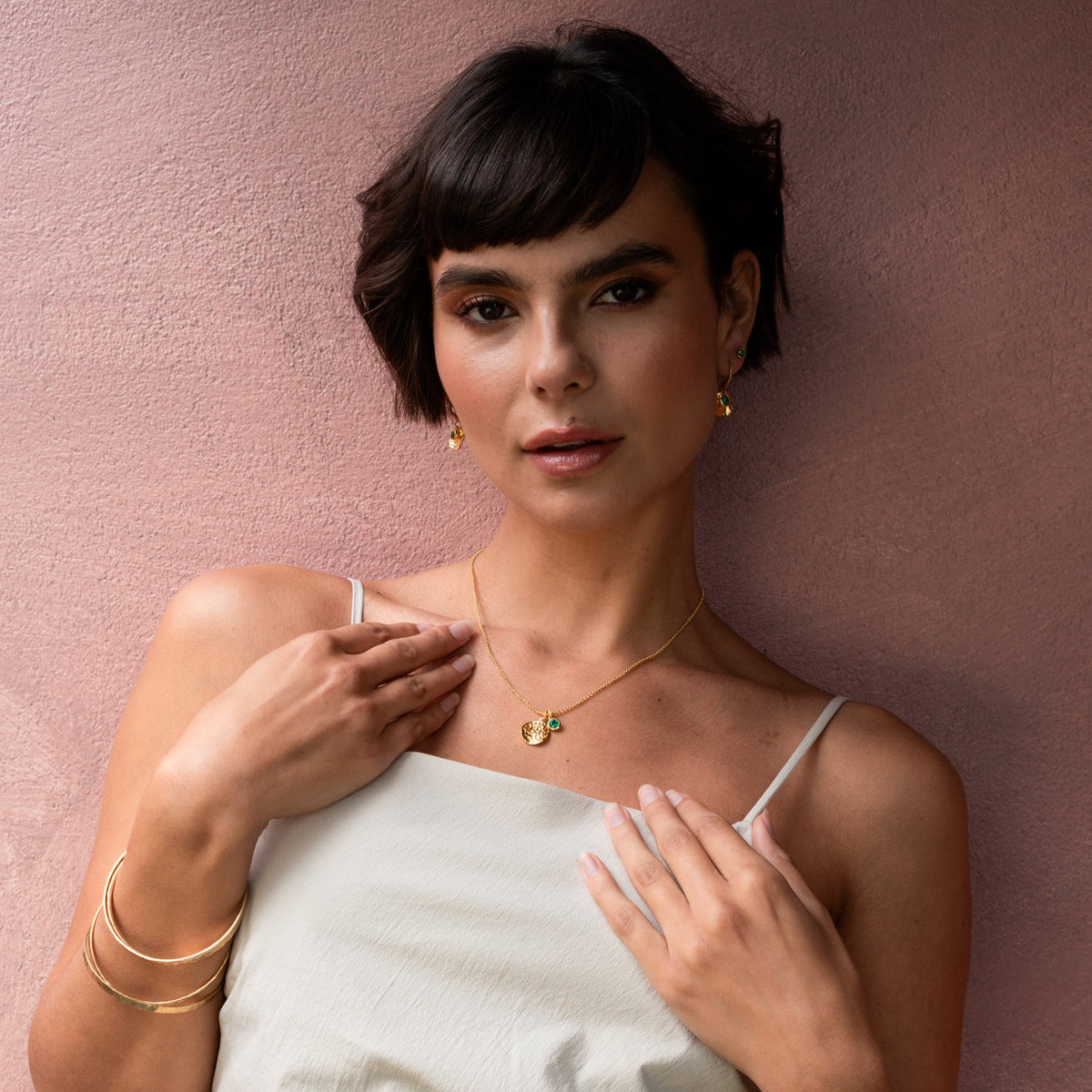 This Hammered Disc & 5mm Green Garnet Array Pendant by Dower & Hall exudes understated elegance. The pendant features a radiant green garnet encased in a rub-over setting, layered with a round disc that bears our signature hammered finish. Available in both sterling silver and yellow gold vermeil finishes.