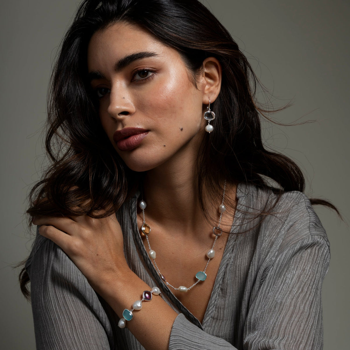Handcrafted in sterling silver or with yellow gold vermeil finish. Five white baroque pearls and four faceted gemstones (amethyst, rock crystal, lemon quartz, green chalcedony). Pebble sizes: 10mm, 15mm, 20mm. Gemstone sizes: 10-14mm.