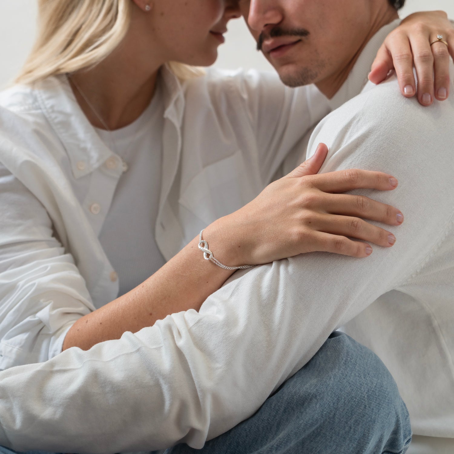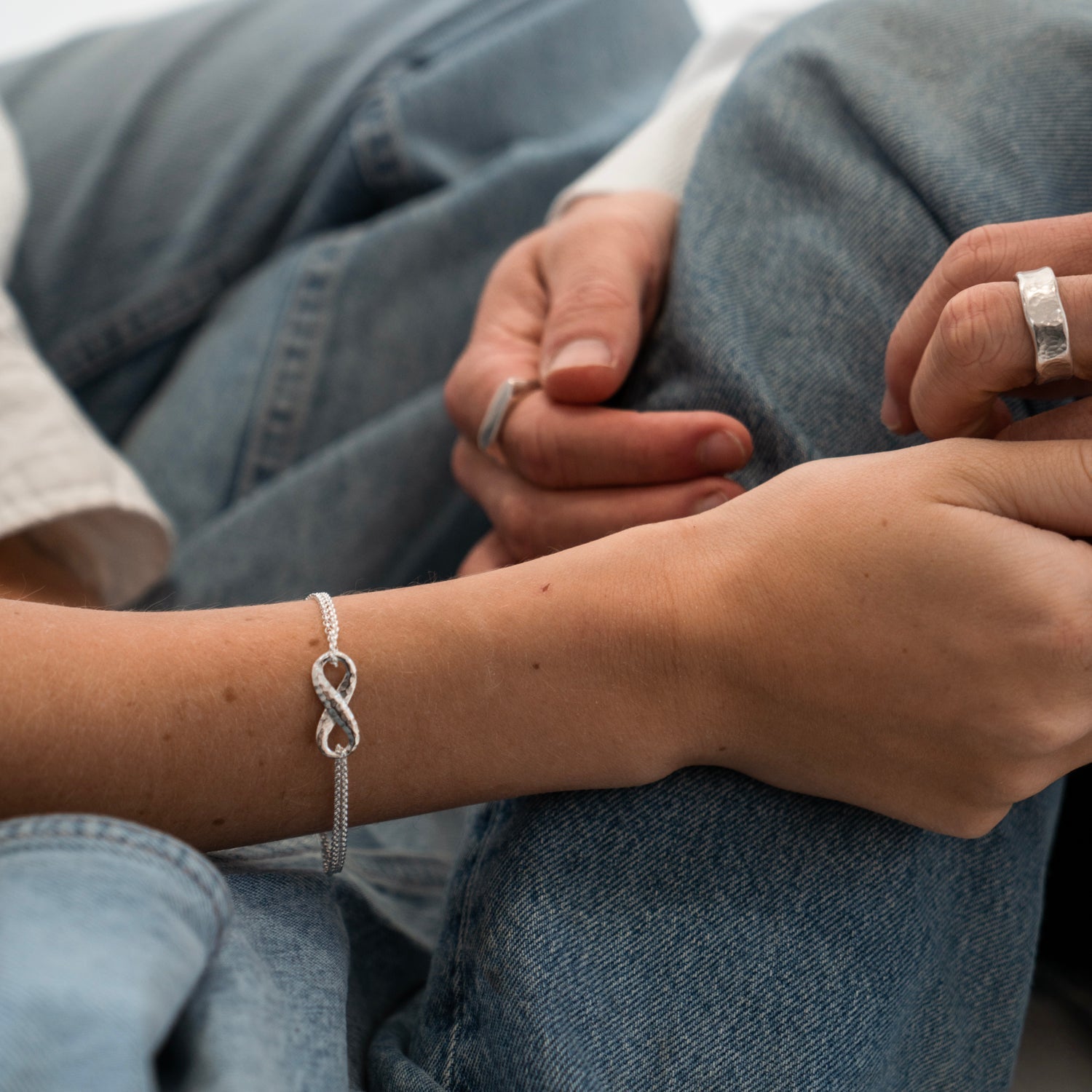 Sterling silver or 18ct yellow gold vermeil. Infinity symbol size: 9 x 22mm. Total length: 7.25 inches.