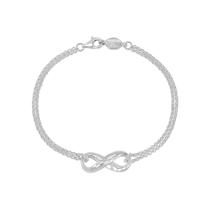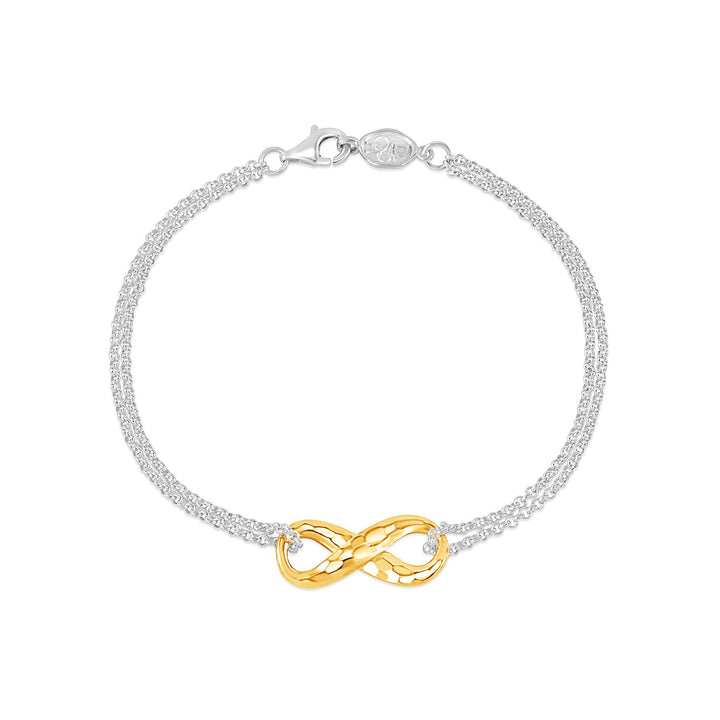 This Entwined Infinity Bracelet by Dower & Hall features the infinity symbol on a fine double chain, symbolizing eternal love. Available in both sterling silver and yellow gold vermeil finishes, the bracelet has a total length of 7.25 inches.