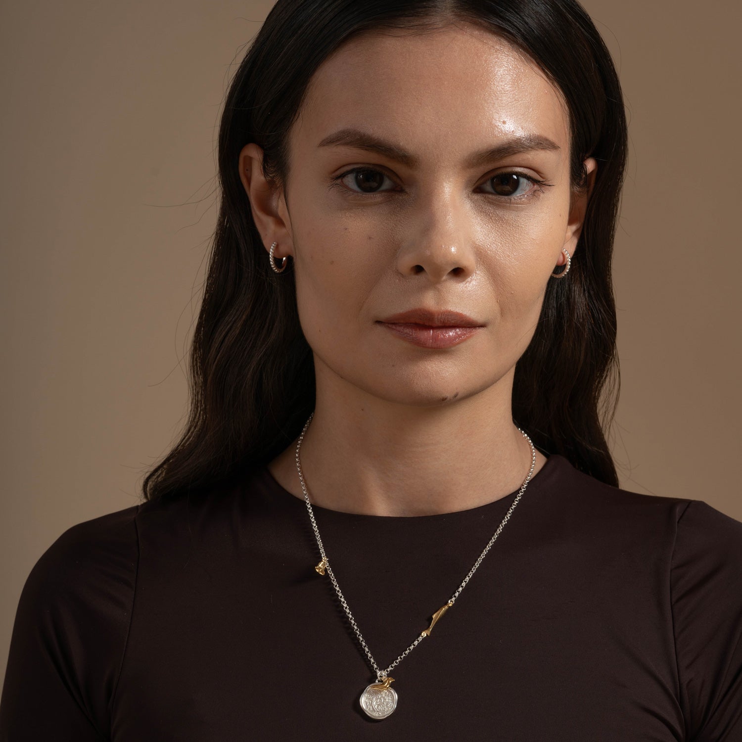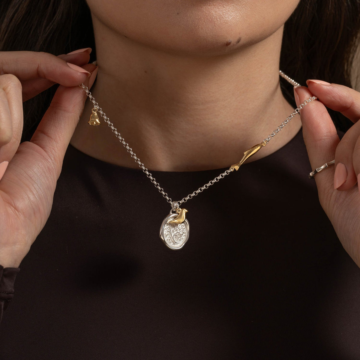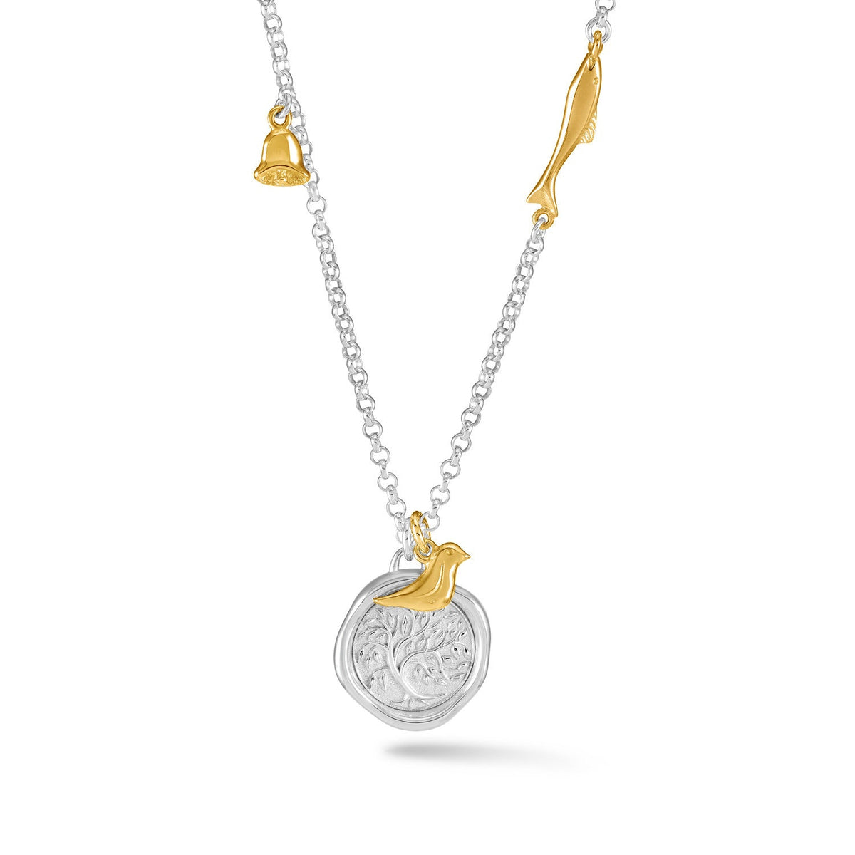 This 'The Glasgow Flourish' Talisman Necklace by Dower & Hall features the iconic symbols from the Glasgow coat of arms, including a tree, bird, bell, and fish, representing St. Mungo's miracles. This unique piece can be engraved to personalize it with initials, a name, or a special message.