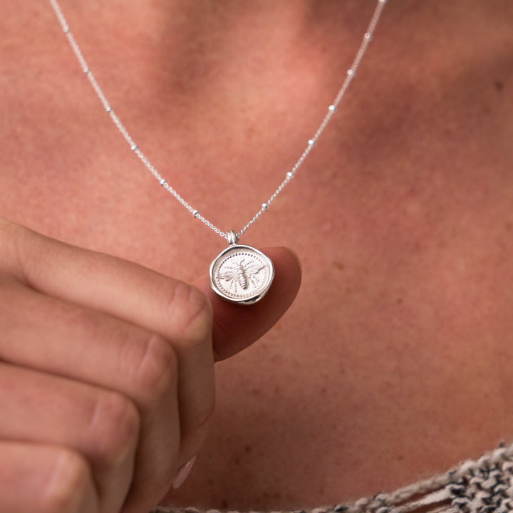 This Queen Bee Talisman Necklace by Dower & Hall symbolizes the importance of life, commitment, and resilience. The ultra-detailed Queen Bee pendant serves as a reminder to protect and honor the bees, essential for our planet's health. The pendant can be engraved on the reverse, allowing for personalization with initials, a name, or a special message.
