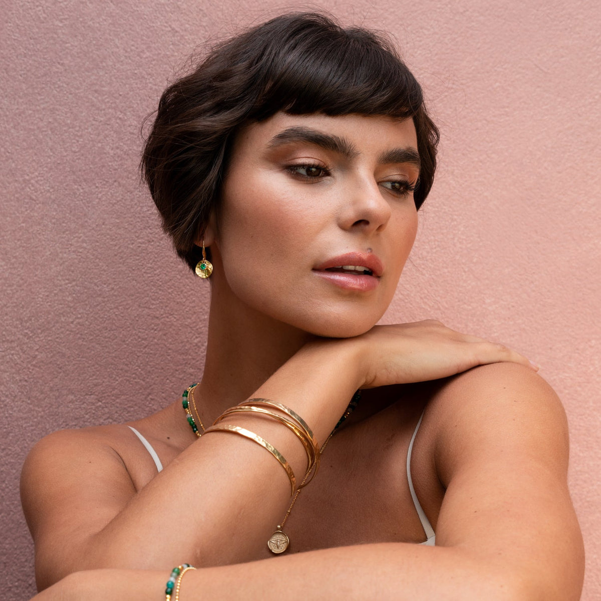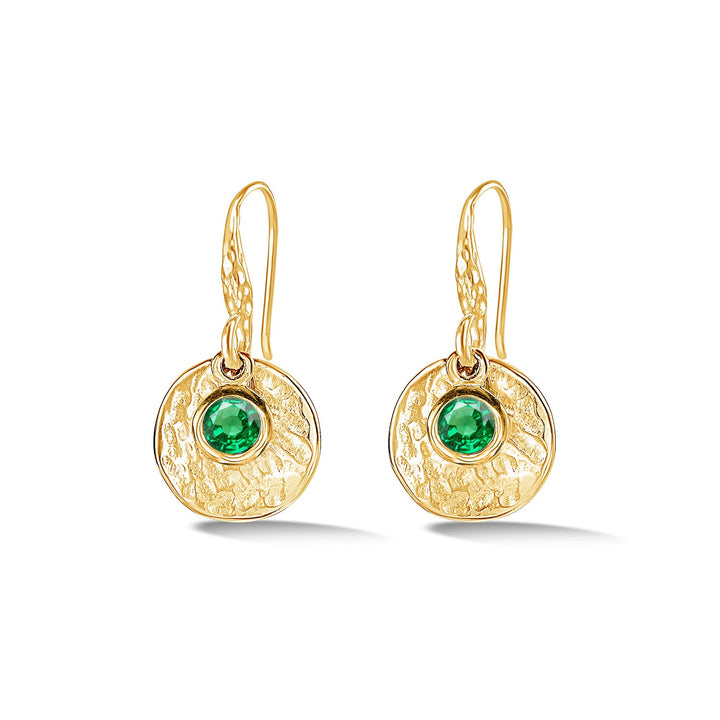 Handcrafted in sterling silver with green garnet gemstones (5mm) and hammered discs (13mm). Total length: approx. 27mm. Available in sterling silver or 18ct yellow gold vermeil finish.