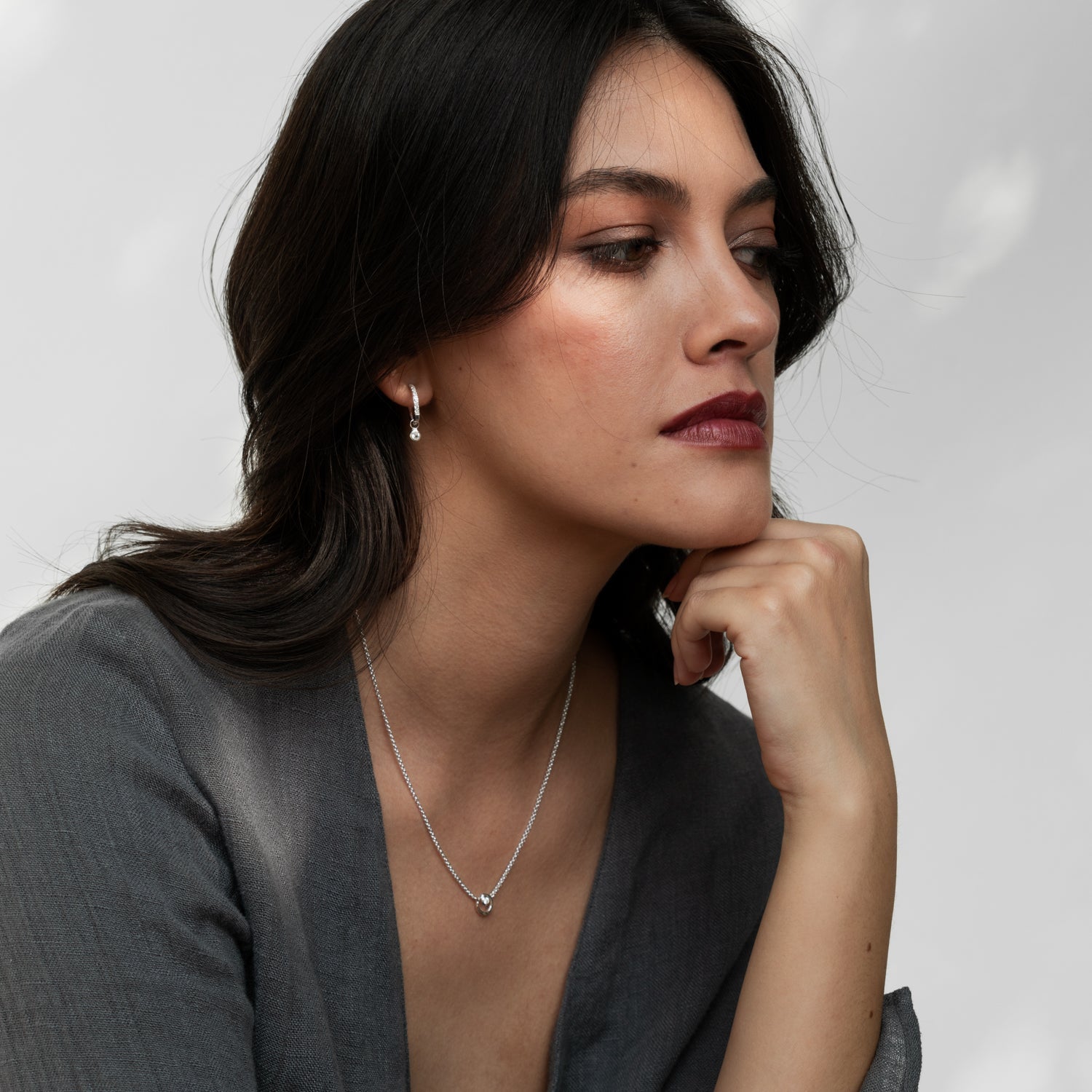 Available in sterling silver or 18ct yellow gold vermeil. Featuring a 3mm white sapphire gemstone set in a Dewdrop charm drop. Hoop size - 15mm.