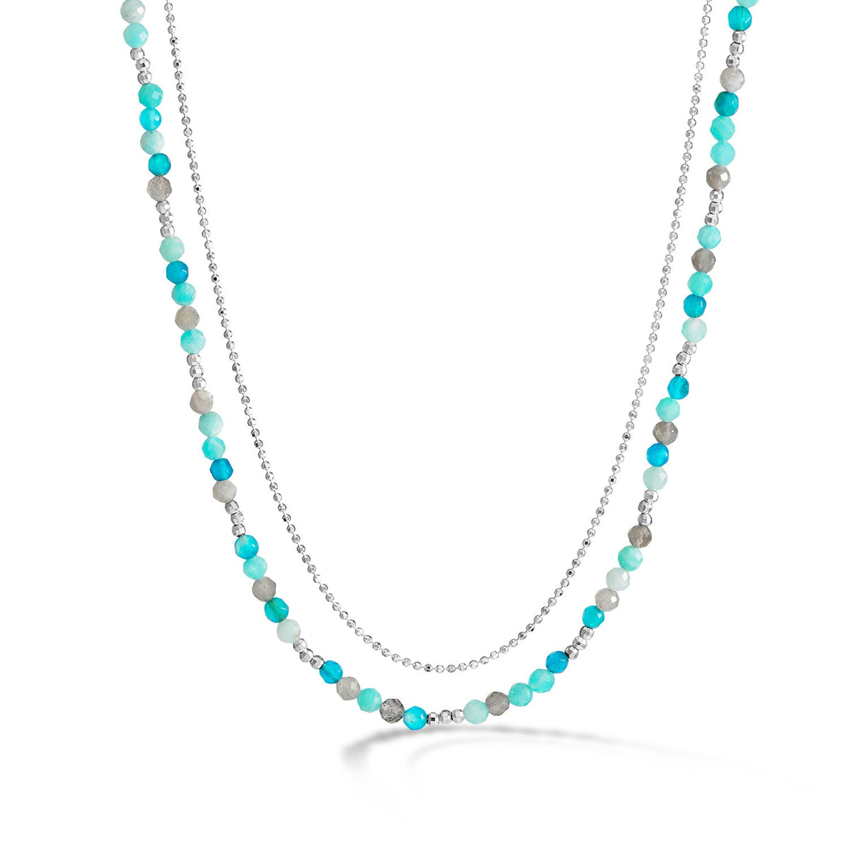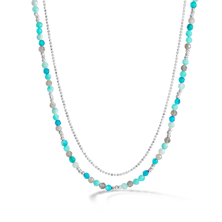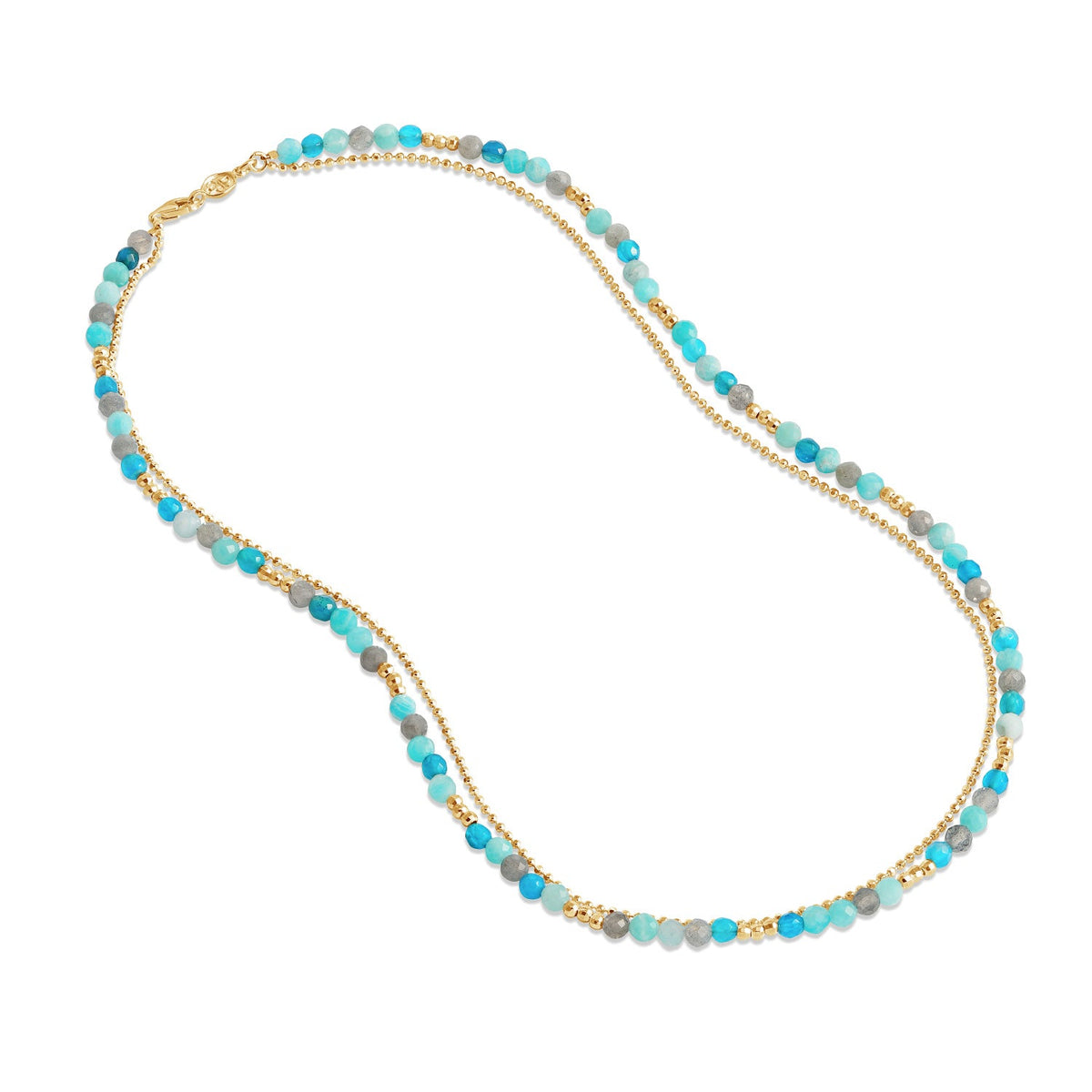 This Ocean Orissa Necklace by Dower & Hall is a beautiful combination of faceted apatite, chalcedony, blue agate, and labradorite gemstone beads. The necklace is complemented by sparkling sterling silver beads and finished with a signature lobster catch, with a radiant yellow gold vermeil option for a luxurious finish. This vibrant necklace is perfect for adding a pop of color to any outfit.