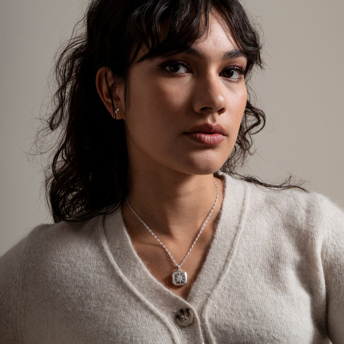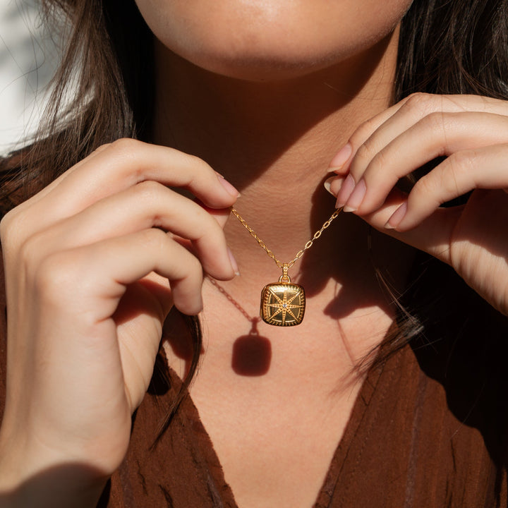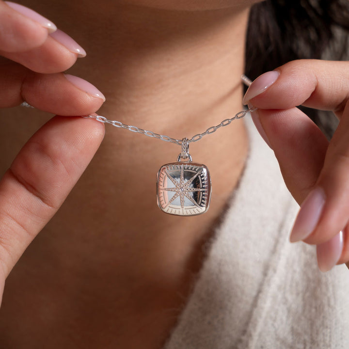 This Sapphire Stellar Locket by Dower & Hall is a stunning way to cherish life's most important moments. The cushion-shaped locket features an intricately carved star and is set with a sparkling white sapphire at its center. The locket opens to hold two personal images, allowing you to keep loved ones close. Suspended from a beautifully textured, adjustable millie-grain chain, this piece can also be engraved for added personalization, making it the perfect sentimental gift.
