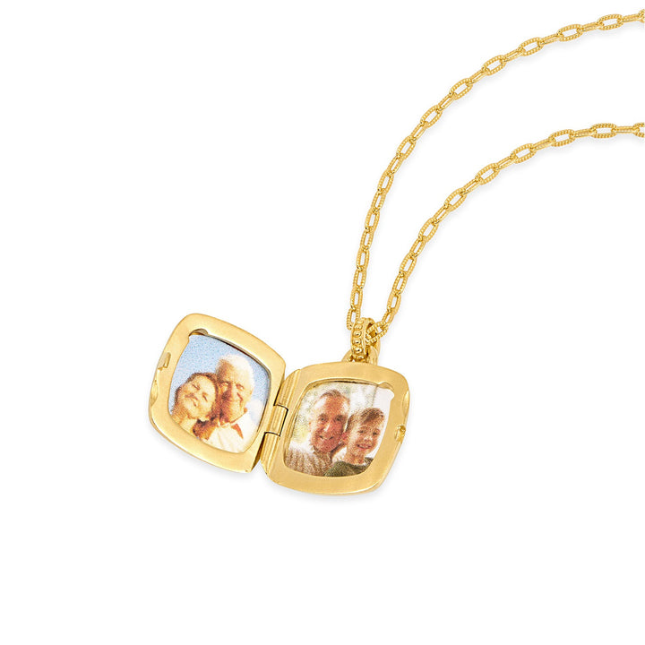 Handcrafted in sterling silver or with yellow gold vermeil finish. Set with white sapphire. Locket size: 17mm.