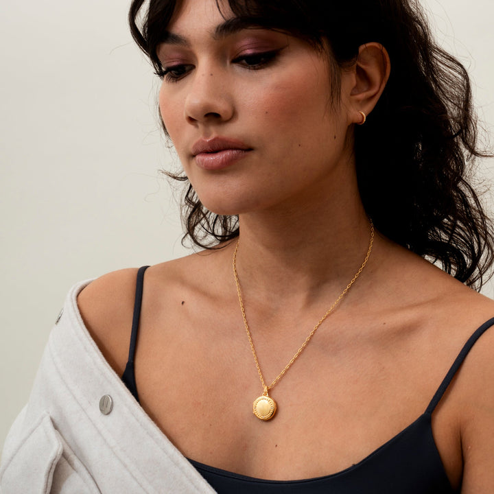 Handcrafted in sterling silver or with yellow gold vermeil finish. Set with four white sapphires. Locket size: 17mm.