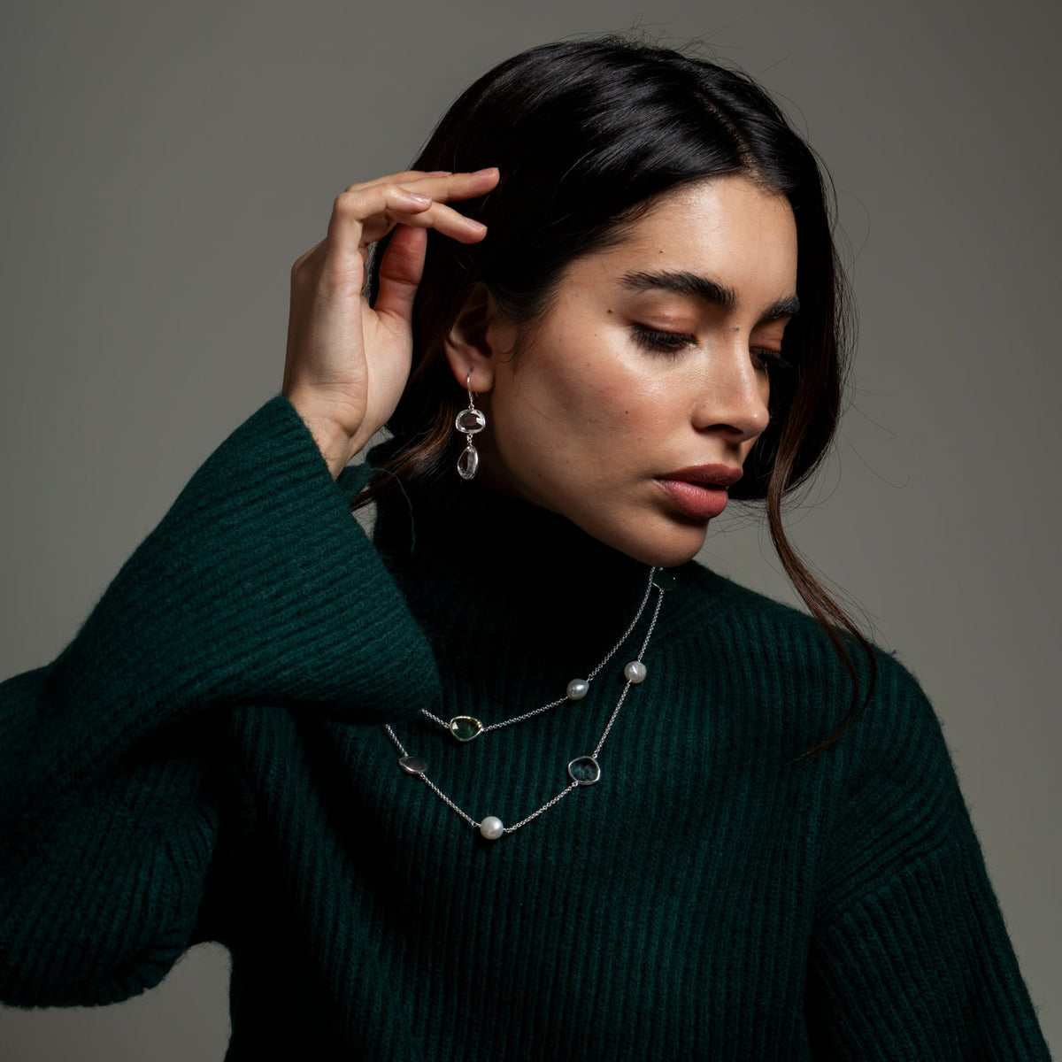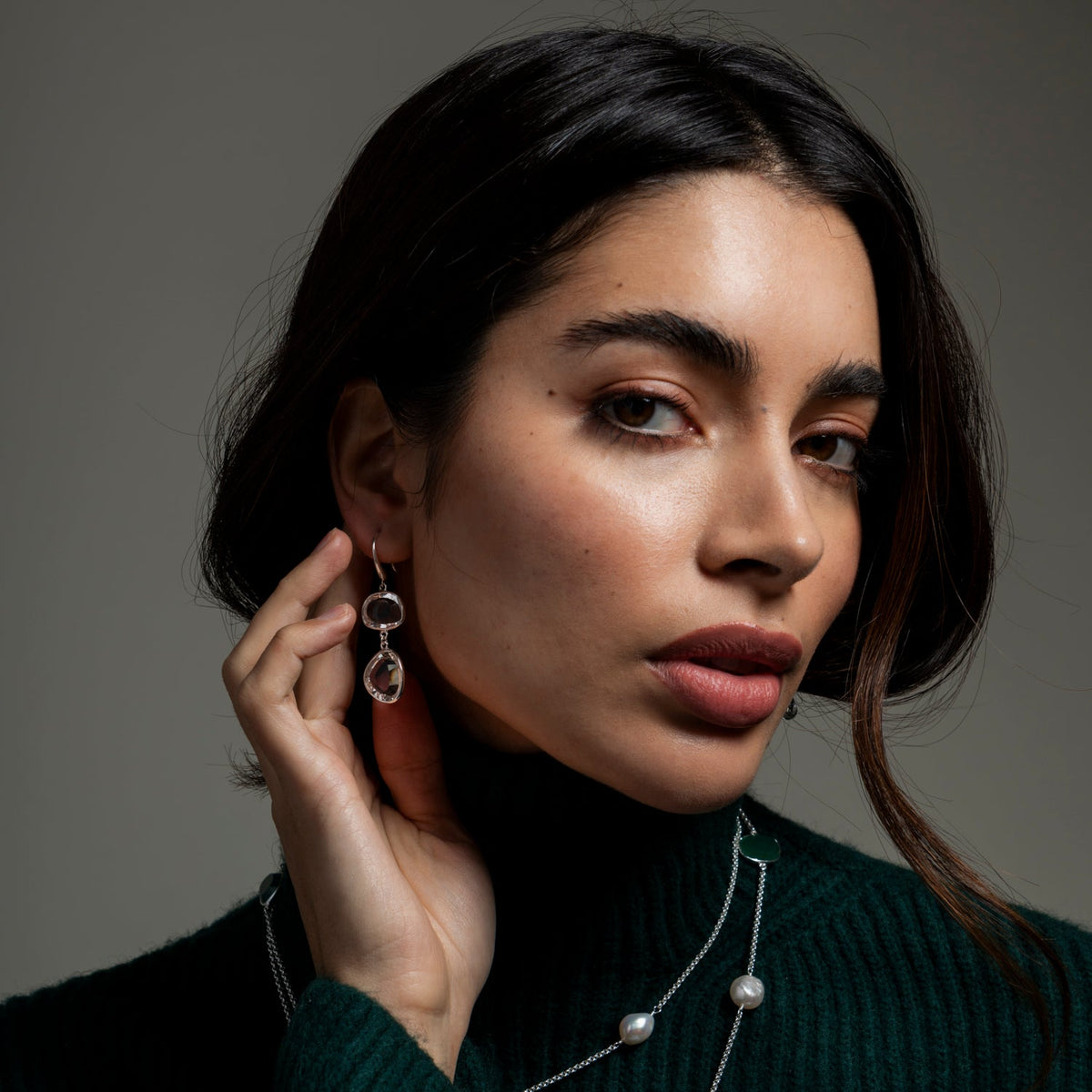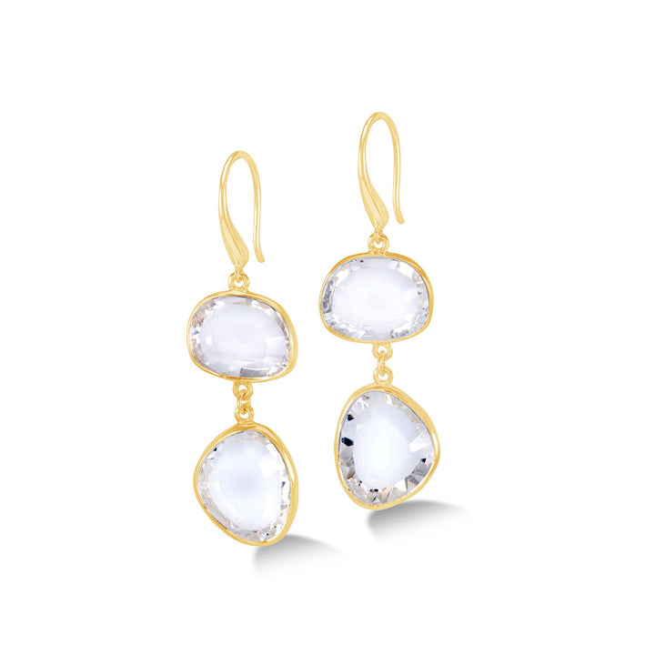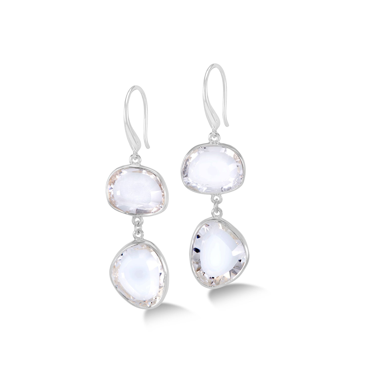 Crafted in sterling silver or 18ct yellow gold vermeil. Featuring two rock crystal gemstones (approx. 10-14mm) with a total length of 50mm.