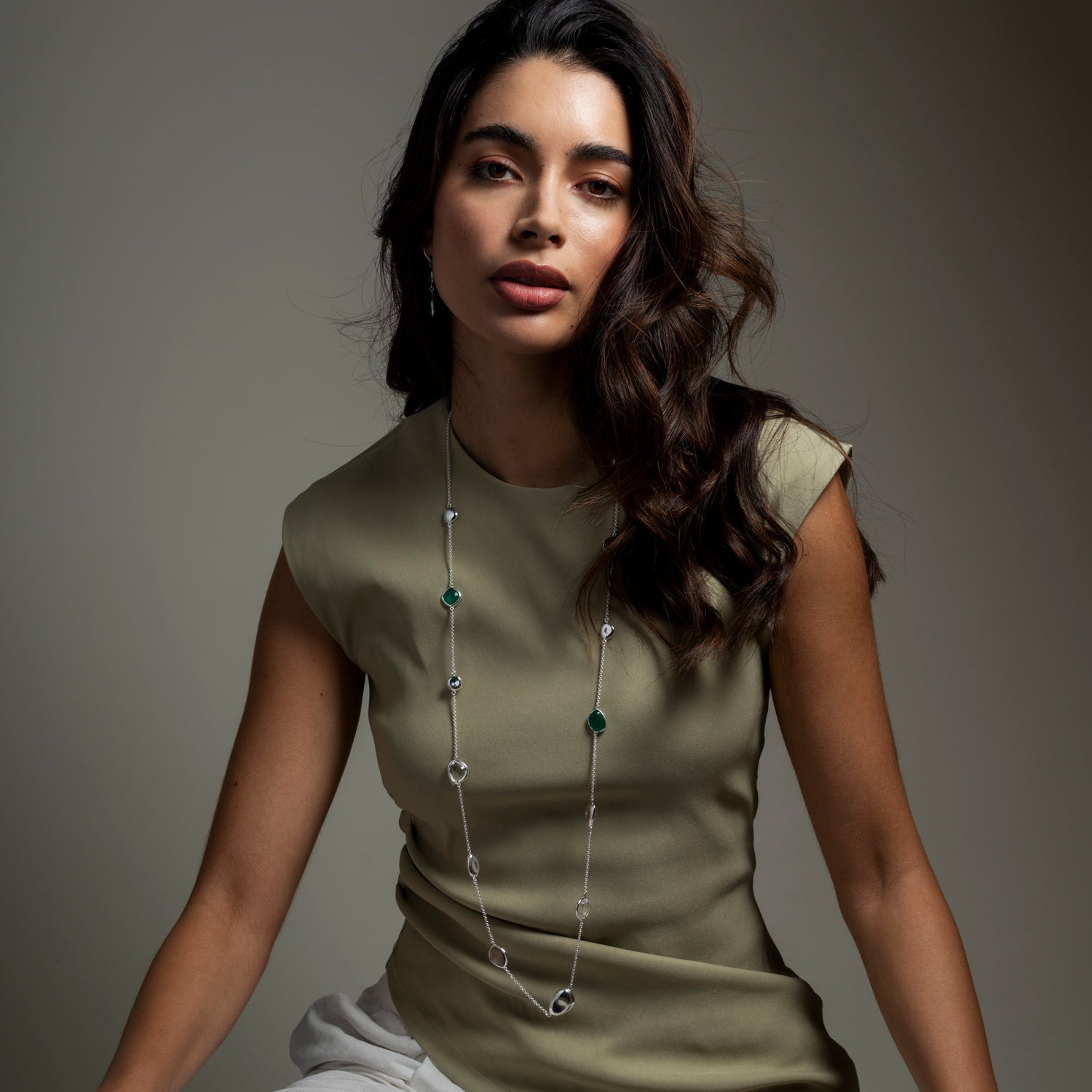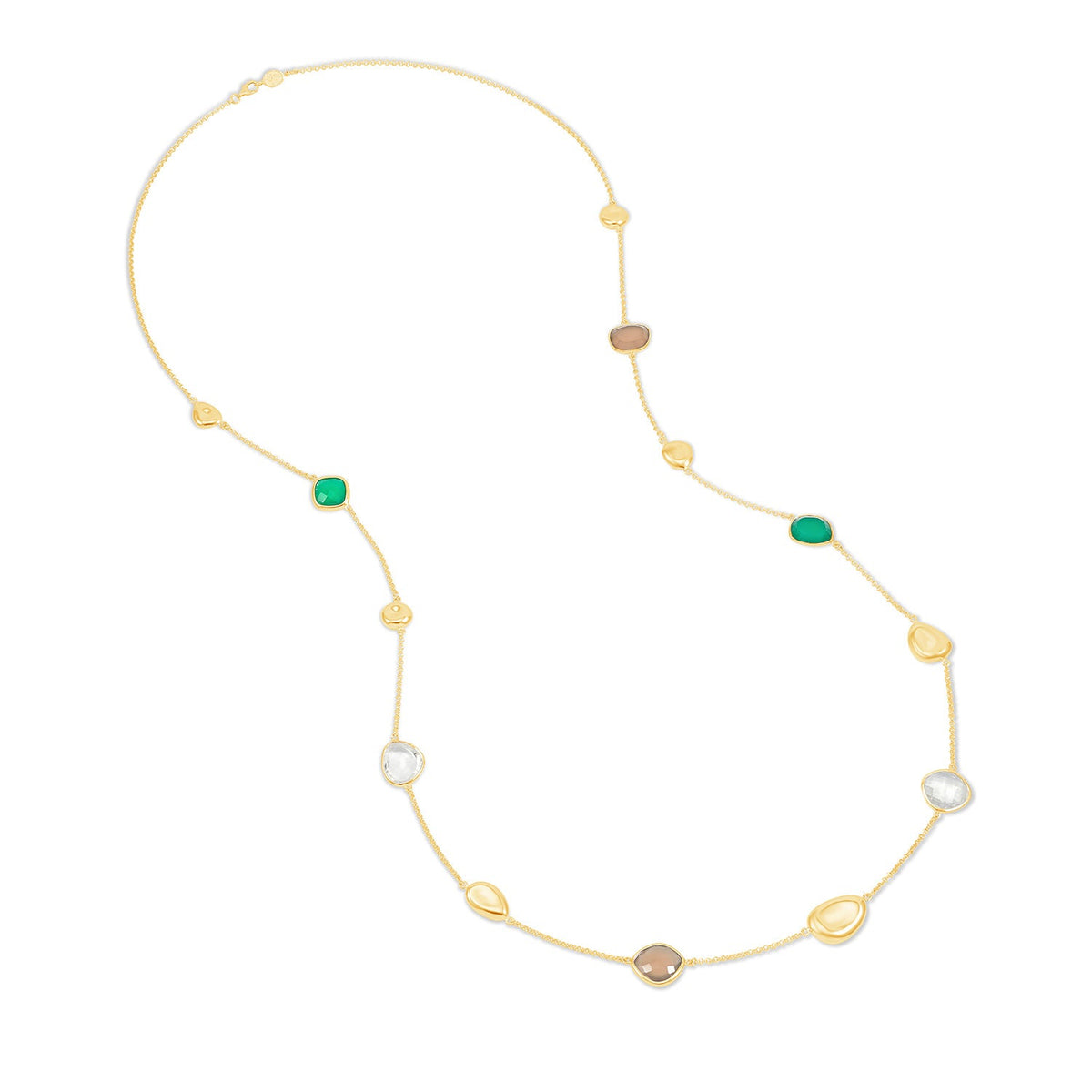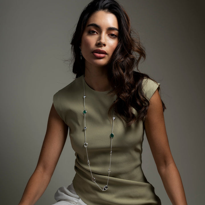 This Green Gemstones & Pebbles Long Necklace by Dower & Hall showcases a range of colorful gemstones, including green onyx, grey agate, lemon quartz, and rock crystal, all set in sculpted pebble pods. This necklace can be worn long or doubled for a more layered look, making it a versatile statement piece for any occasion.