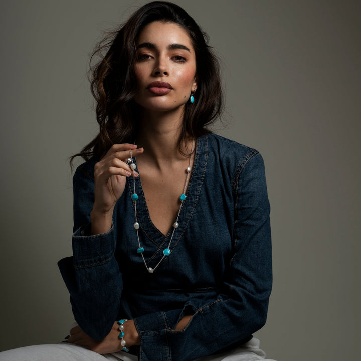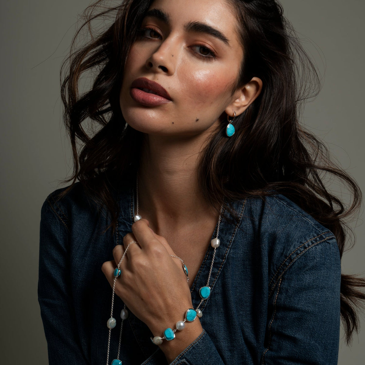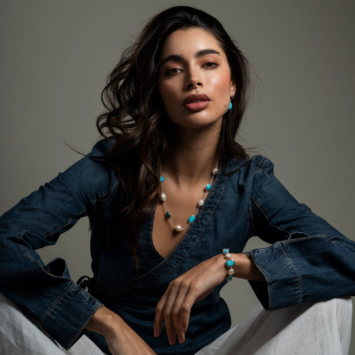 This Turquoise & Pearl Pebble Bracelet by Dower & Hall is a striking statement piece, featuring large white baroque pearls and turquoise gemstones encased in sterling silver. The bracelet is adjustable, with a secure lobster catch, and exudes understated elegance with its focus on the beautiful stones. Ideal for both bold and delicate designs, this bracelet is perfect for layering or wearing solo.